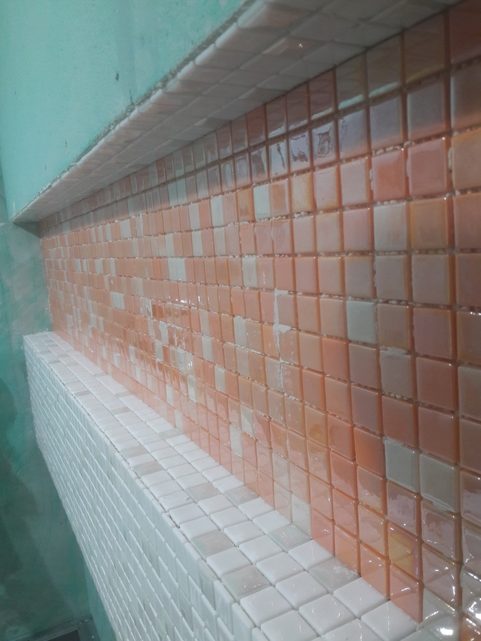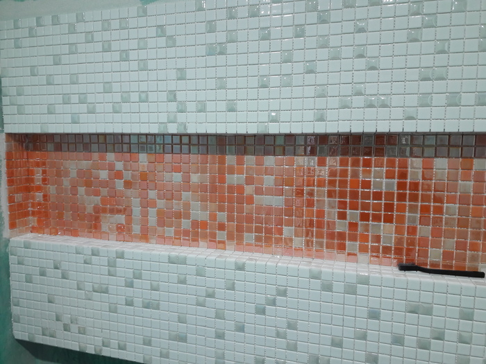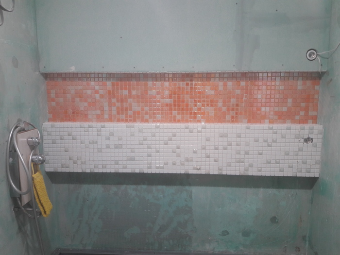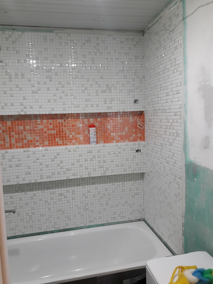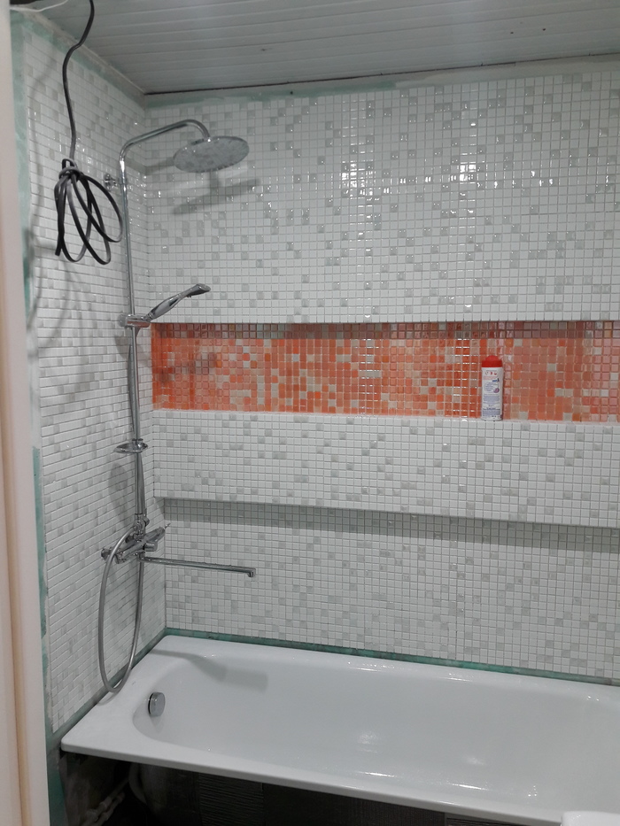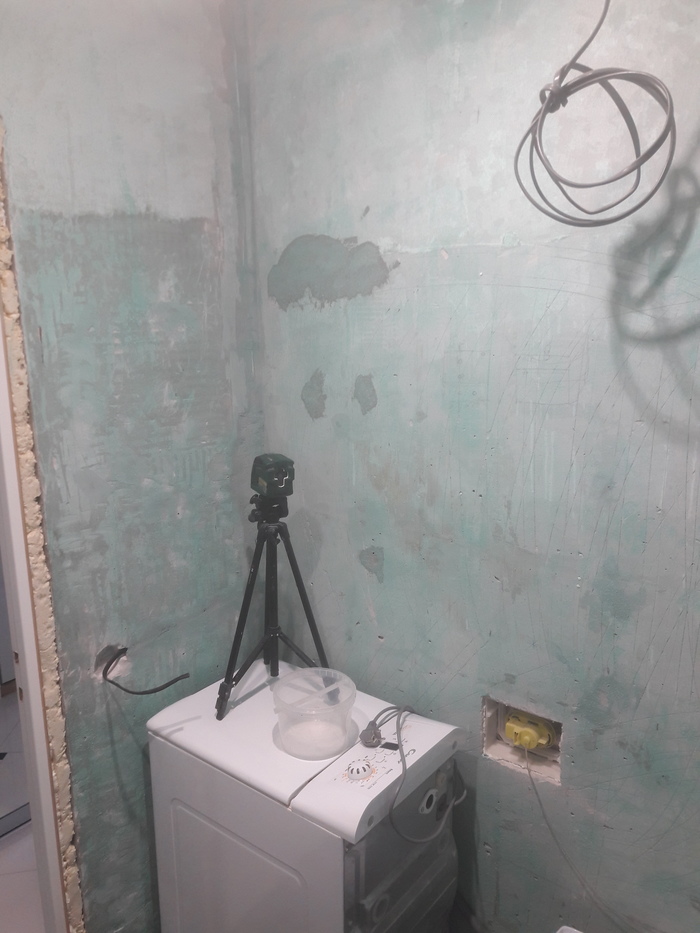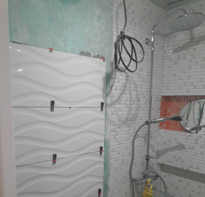 Со стен снял всю плитку и в штрабу уложил кабели (отдельно 4 кабеля от щитка на стиральную машину, на розетку, освещение общее, подсветка нишы.).