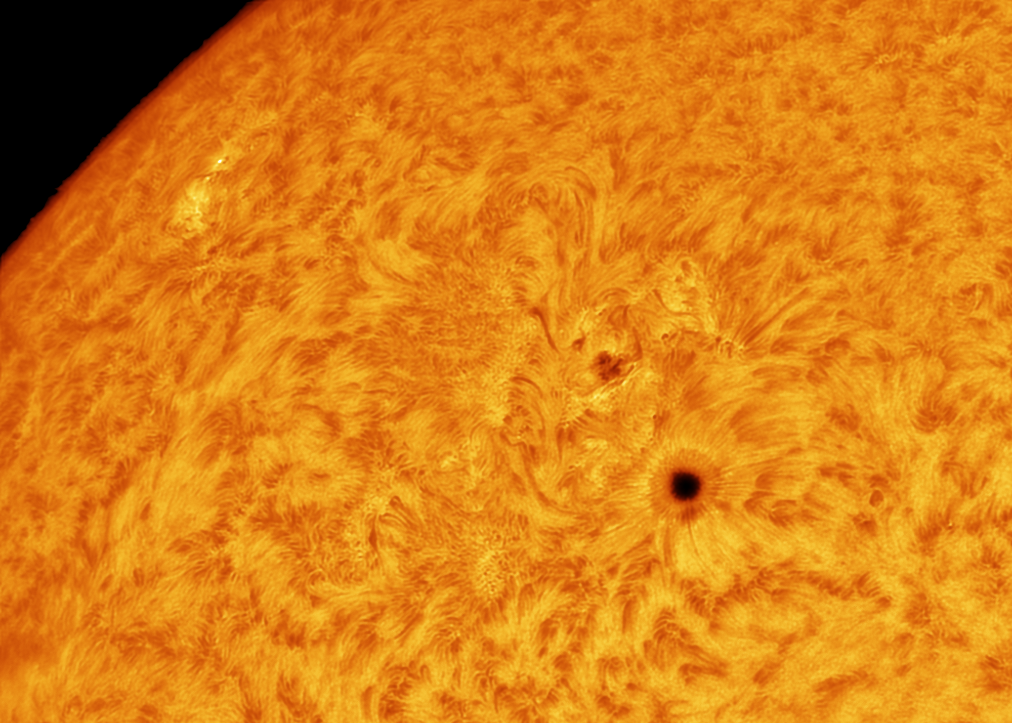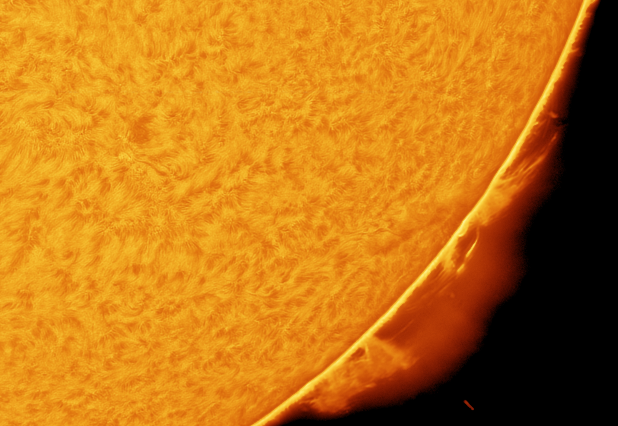Перед работой быстренько заснял красивое пятно и несколько жирненьких протуберанцев в линии водорода.