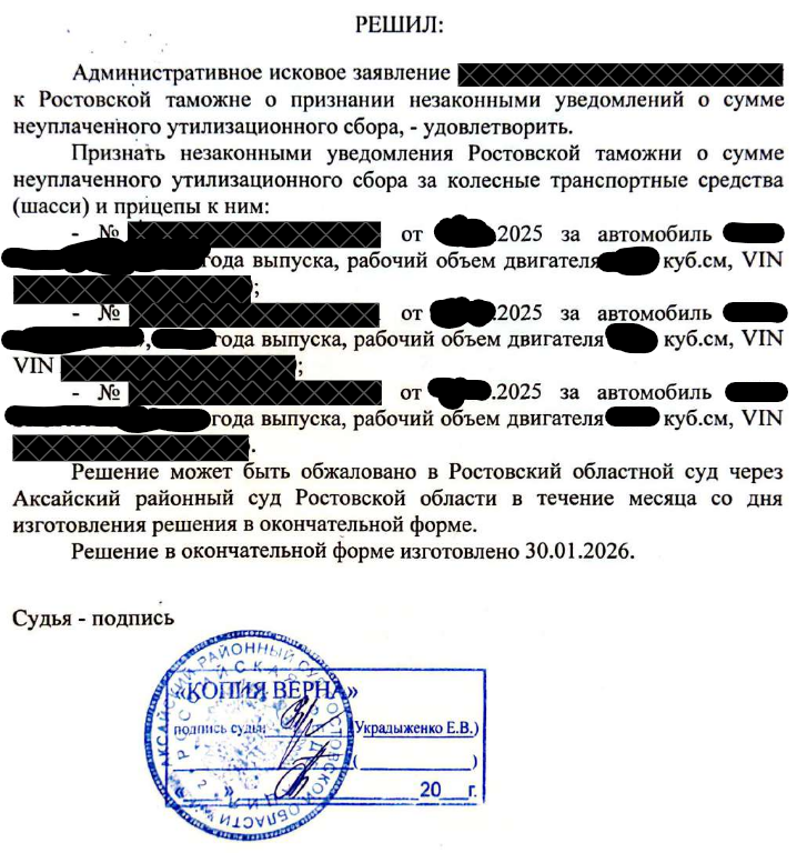 Аксайский районный суд признал незаконными доначисления утильсбора по авто из Казахстана, ввезенным в 2024 году. Суд учел добросовестность плательщиков и ошибки в первичной проверке документов таможней. Прокуратура поддержала иск, подтвердив нарушения.