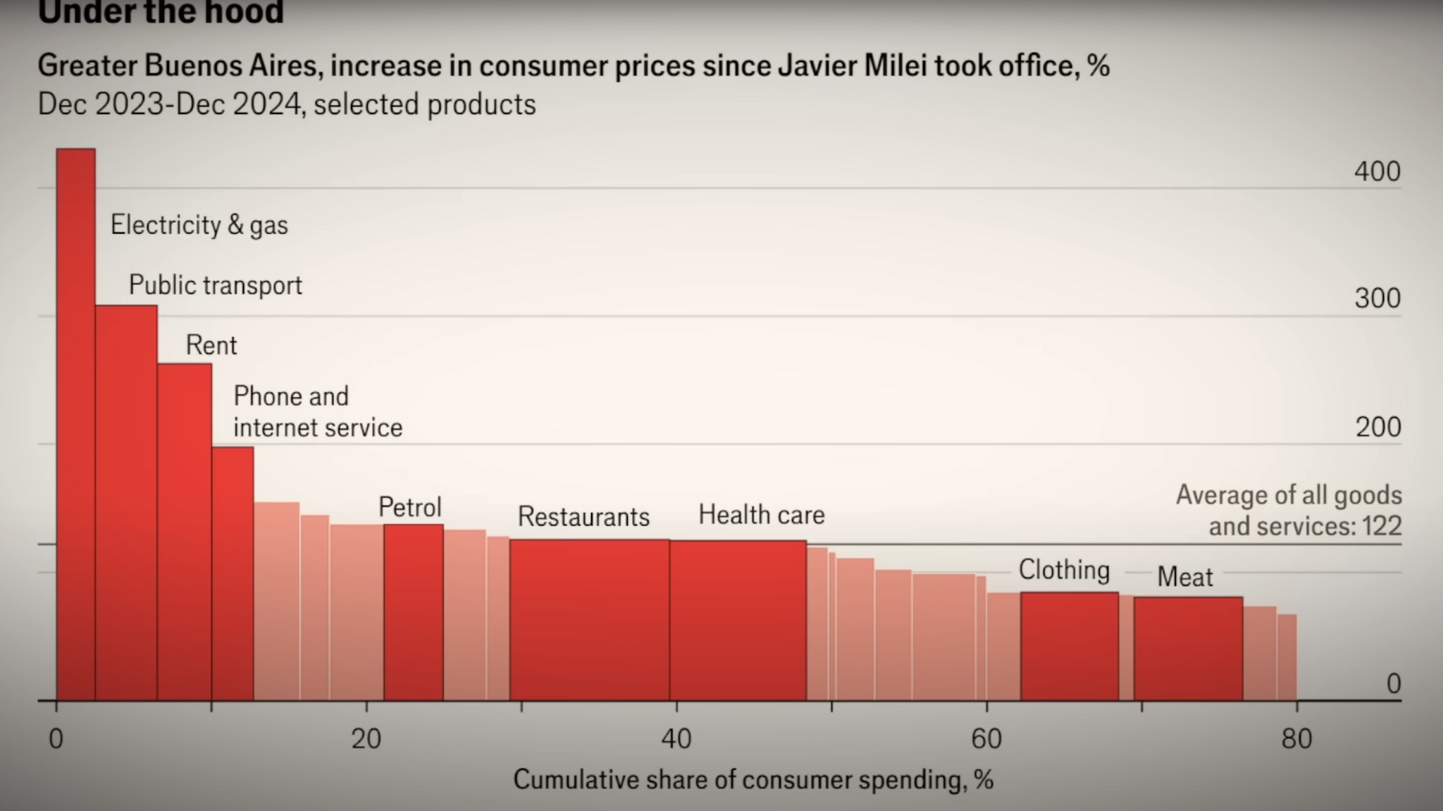 Параллельно в Аргентине президент Хавьер Милей, пришедший к власти в 2023 году, проводит радикальные либертарианские реформы. Он сократил госрасходы с 37% до 31% ВВП, девальвировал песо с 400 до 820 за доллар, провел приватизацию нефтегазового сектора, банков и авиакомпаний. Однако результаты плачевны: инфляция, достигшая 211% в 2023 году, снизилась до 117% в 2024-м, но цены на товары первой необходимости выросли на 122-430%. Уровень бедности вырос с 40% до 53%, а безработица — с 5,5% до 7,5%. Закрылись 16 тысяч малых и средних предприятий, а зарплаты 70% преподавателей упали ниже черты бедности. При этом крупные бизнесмены, такие как Маркос Гальперин, увеличили свои состояния на 55%, а иностранные инвесторы получили доступ к аргентинским ресурсам.