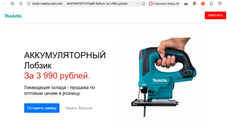 На одностраничном сайте продается якобы аккумуляторный лобзик Макита, за 3990 руб., после заказа звонит девушка, предлагает взять комплект подороже, с двумя аккумами и зарядкой… Заказал лобзик за 3990 руб., доставка 800 руб., товар отправляется наложенным платежом, т.е. оплачиваешь, потом тебе отдают товар и только тогда можно посмотреть, что там за чудо лобзик.