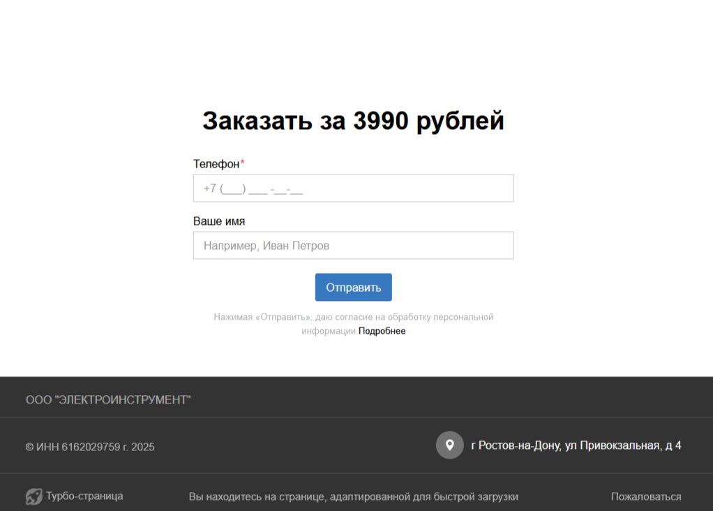 1. На сайте https://lobzik-makita.turbo.site/ продавцом указано ООО «Электроинструмент» ИНН 6162029759 г.Ростов-на-Дону. Проверка показала, что это реальная компания: работает 26 лет. По данным ФНС за 2024 — предприятие с численностью 2 сотрудника. за 2024 год, выручка контрагента 30,5 млн ₽. Она выросла. Динамика положительная по сравнению с 2023 годом. Прибыль контрагента за 2024 год составила 14 тыс ₽. Руководитель Маркелова Галина Николаевна, учредители: ООО "ЭЛТЕХ" с 11 января 2021 50% 5 тыс ₽ ИНН 6164243814 и ООО "ЗАВОД"ЭЛЕКТРОИНСТРУМЕНТ" С 20 ноября 2002 50% 5 тыс ₽ ИНН 6162034646. Какое отношение данная фирма имеет к сайту и товара непонятно (позвонить к ним получится только после выходных).