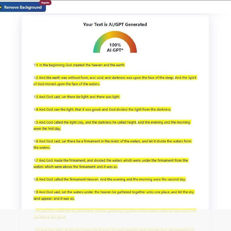 7 makasin4ik Проверка генерации текста от ИИ через ZeroGPT 13 часов назад Проверка генерации текста от ИИ через ZeroGPT. Смешно :(Библия: 100% ИИ.Конституция США: 70% ИИ.Гимн Великобритании: 72% ИИ.🟪 MAX ❤ TG Кросспостинг Pikabu Publish Bot Telegram (ссылка) 1 Ещё 0