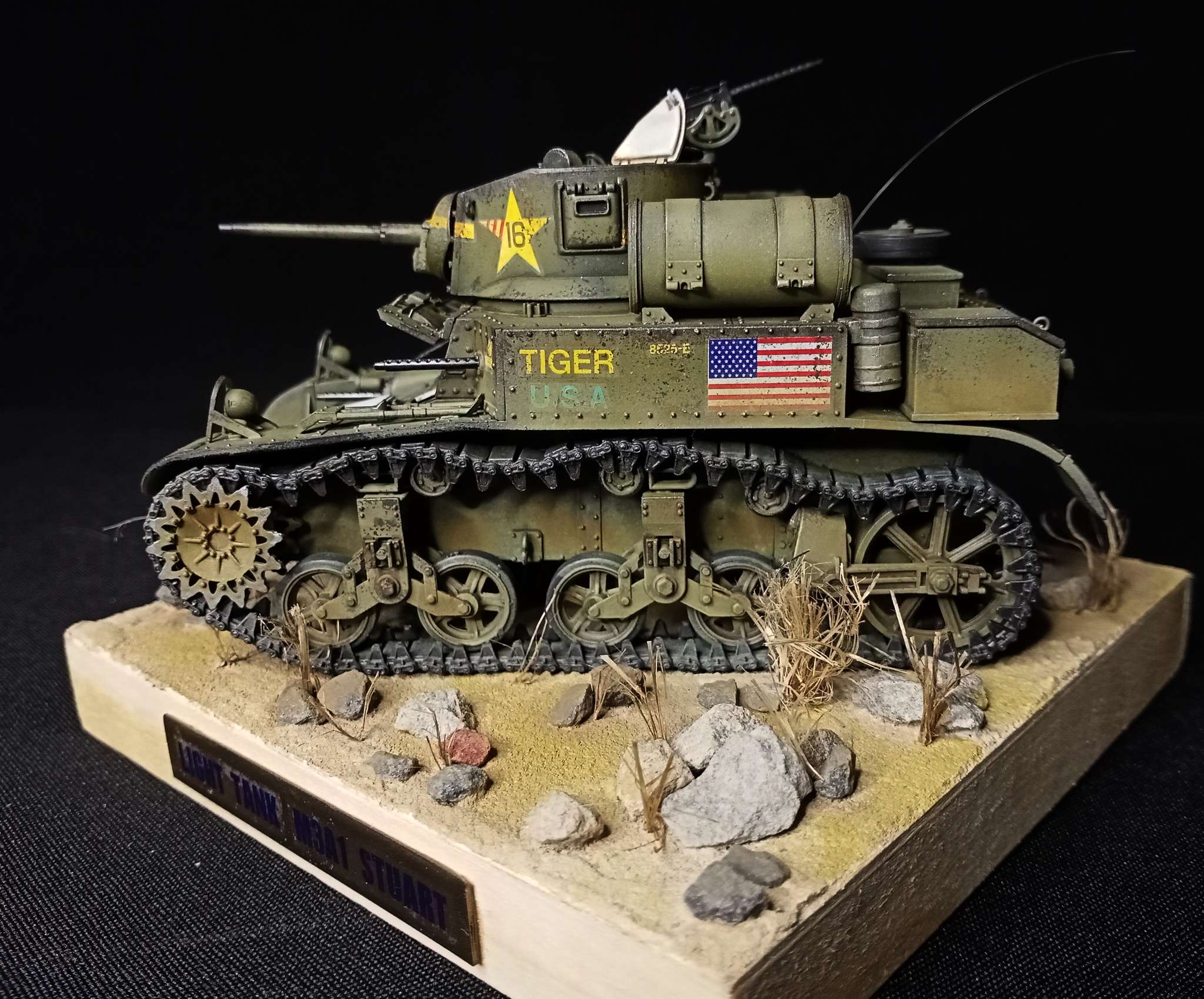 Представлена модель M3A1 Stuart по прозвищу «Tiger» армии США из состава третьего взвода группы «С» 1-го Бронетанкового батальона 1-й бронетанковой дивизии, Тунис, декабрь 1942 года. Модель с частичным интерьером фирмы Academy, мини-диорама самодельная, масштаб 1/35.