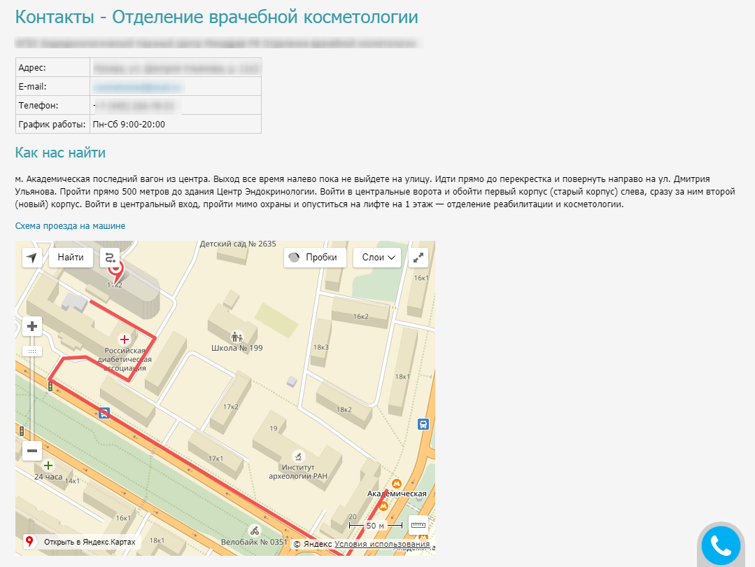 м. Академическая последний вагон из центра. Выход все время налево пока не выйдете на улицу. Идти прямо до перекрестка и повернуть направо на ул. Дмитрия Ульянова. Пройти прямо 500 метров до здания Центр Эндокринологии. Войти в центральные ворота и обойти первый корпус (старый корпус) слева, сразу за ним второй (новый) корпус. Войти в центральный вход, пройти мимо охраны и опуститься на лифте на 1 этаж — отделение реабилитации и косметологии.