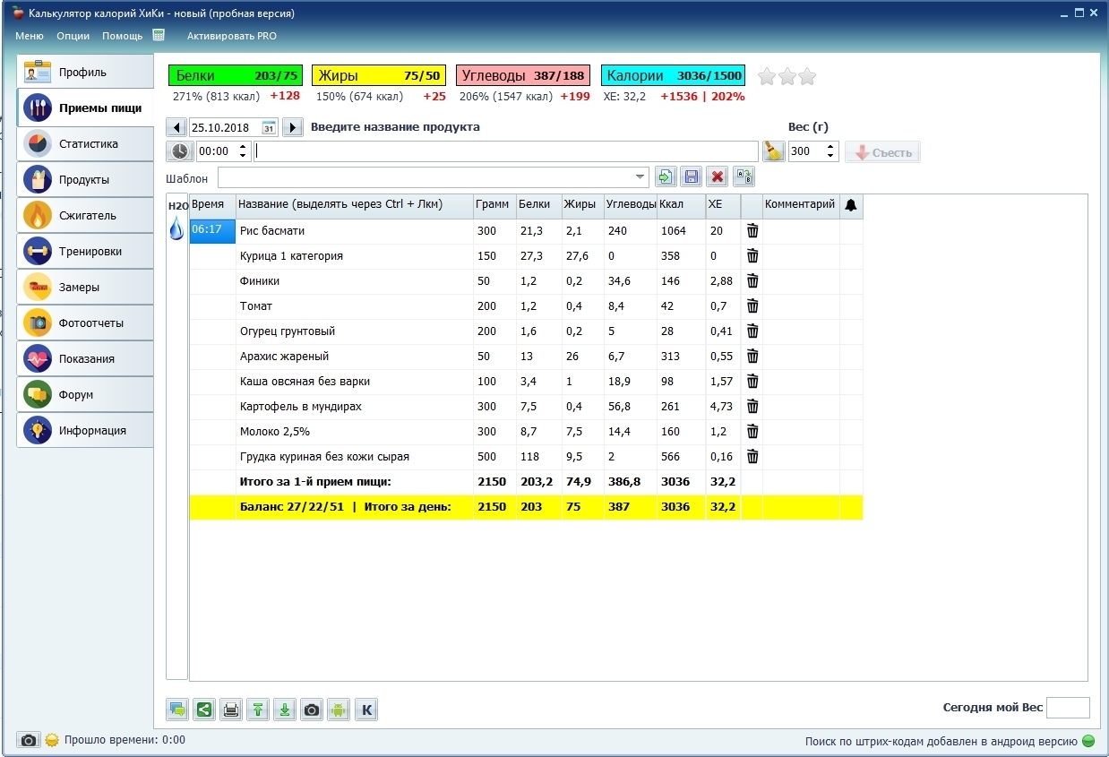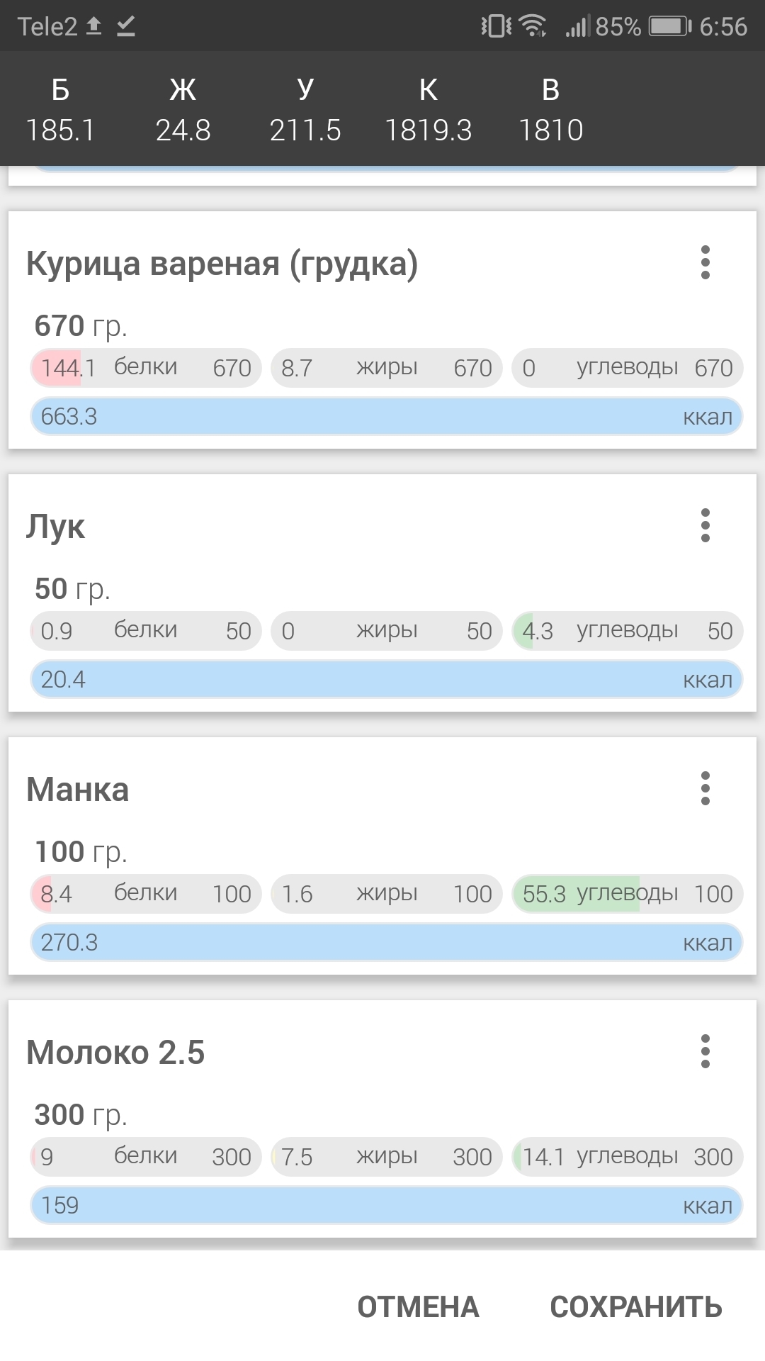Данный рацион включает до 400гр. Углеводов, около 200гр белка и около 100гр жиров, если не лить много масла в блюда.