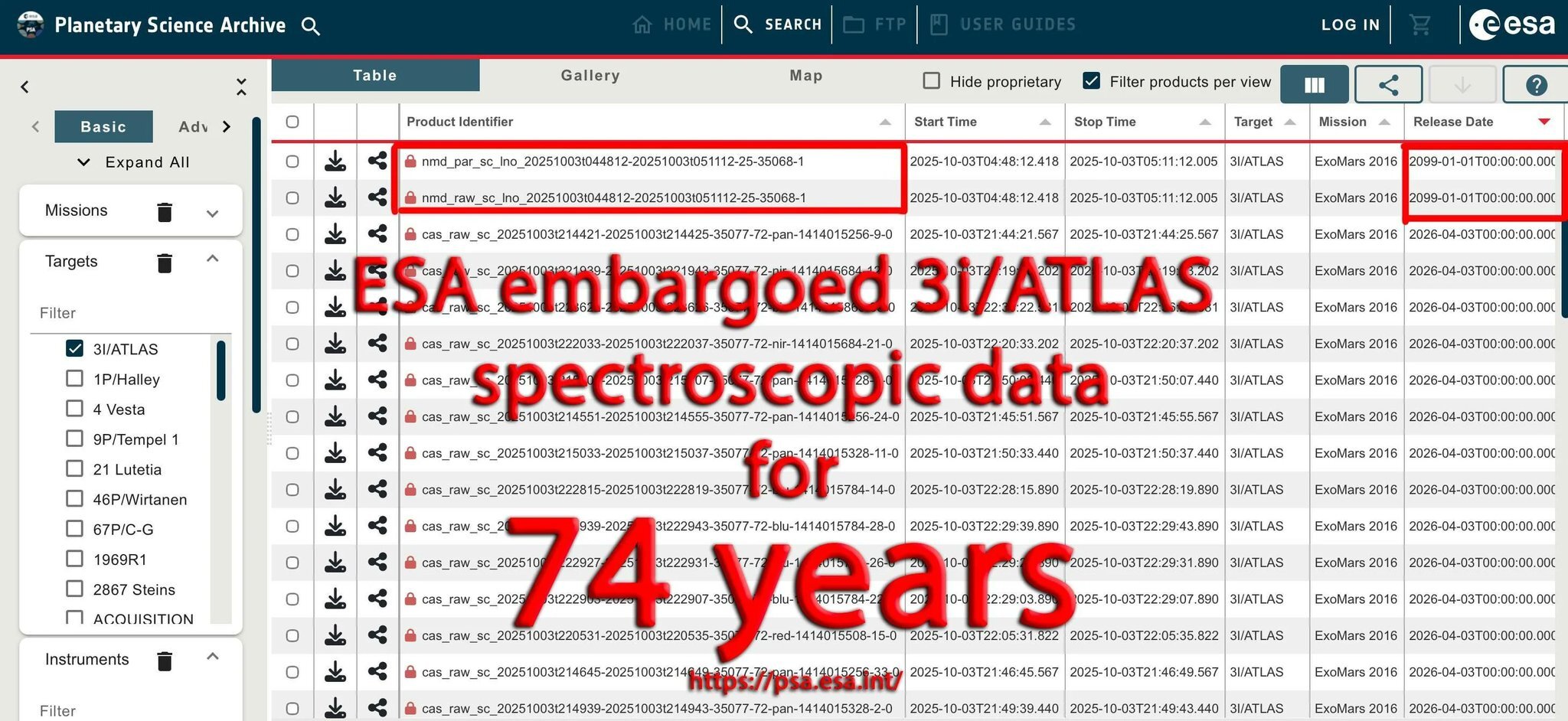 В архиве ESA (Planetary Science Archive) для данных о межзвёздном объекте 3I/ATLAS (наблюдения с миссии ExoMars) некоторые файлы спектроскопических данных (из инструмента NOMAD) указаны с датой релиза 1 января 2099 года. Это видно на скриншоте, который распространяется в Reddit и X. Вот он: