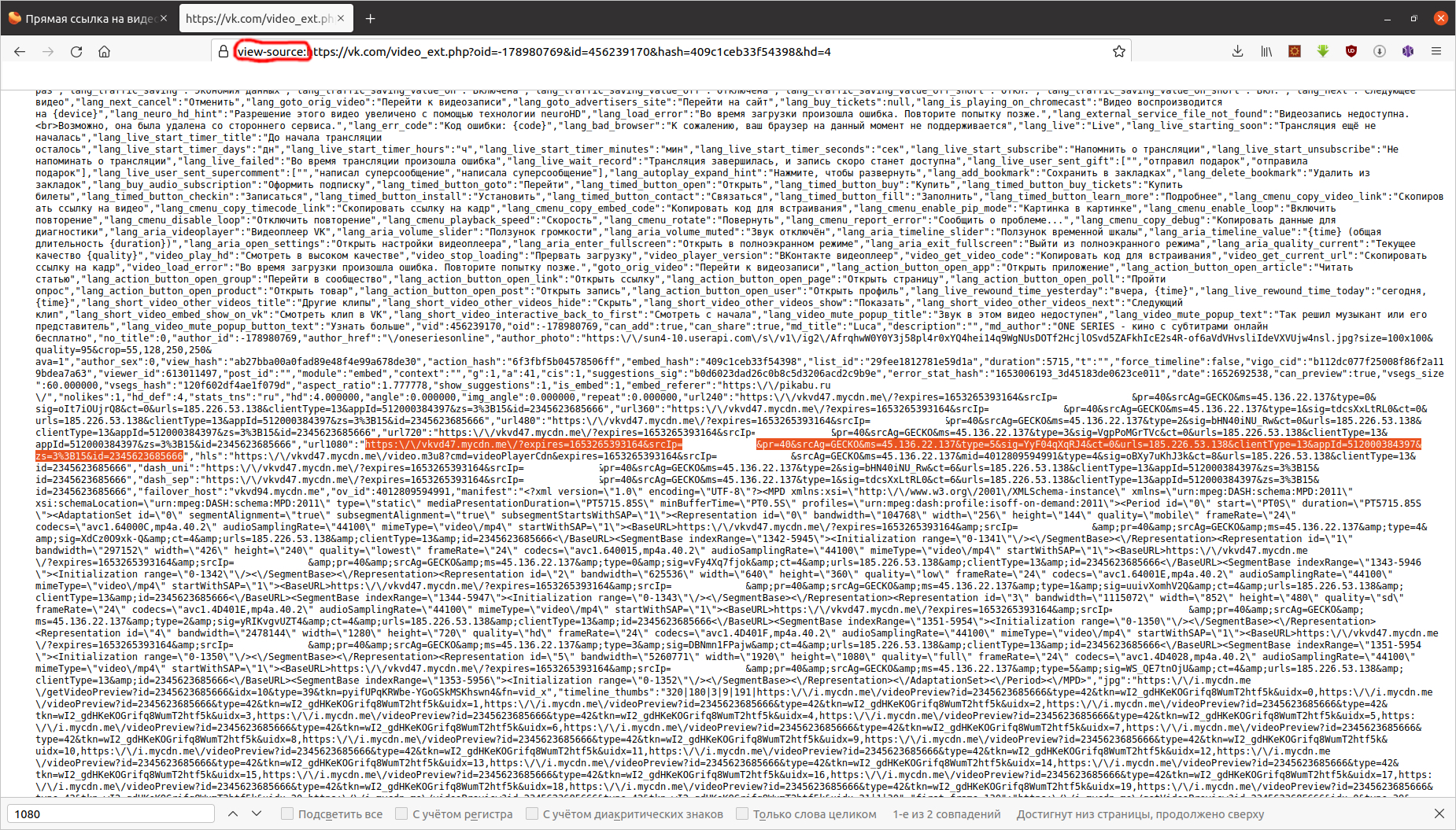 Видео не даст открыть исходник из контекстного меню, поэтому вписываем ручками в адресную строку "view-source:" (выделено красным). Находим "1080", за ним будет адрес видео (выделен на скрине), убираем лишнее из него. Поубирал со скрина свой IP-адрес, не обращайте внимание