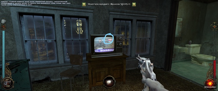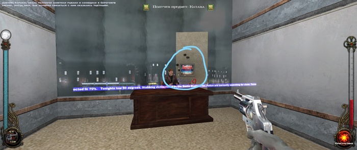 Залетаем в комнату и видим студию, в которой снимают новости. Дальше - больше, несколько раз стреляем в стену, возвращаемся в стартовую комнату и видим, что и в телевизоре видны следы от пуль на стене. Т.е. всё это время новости крутятся из студии в реальном времени.