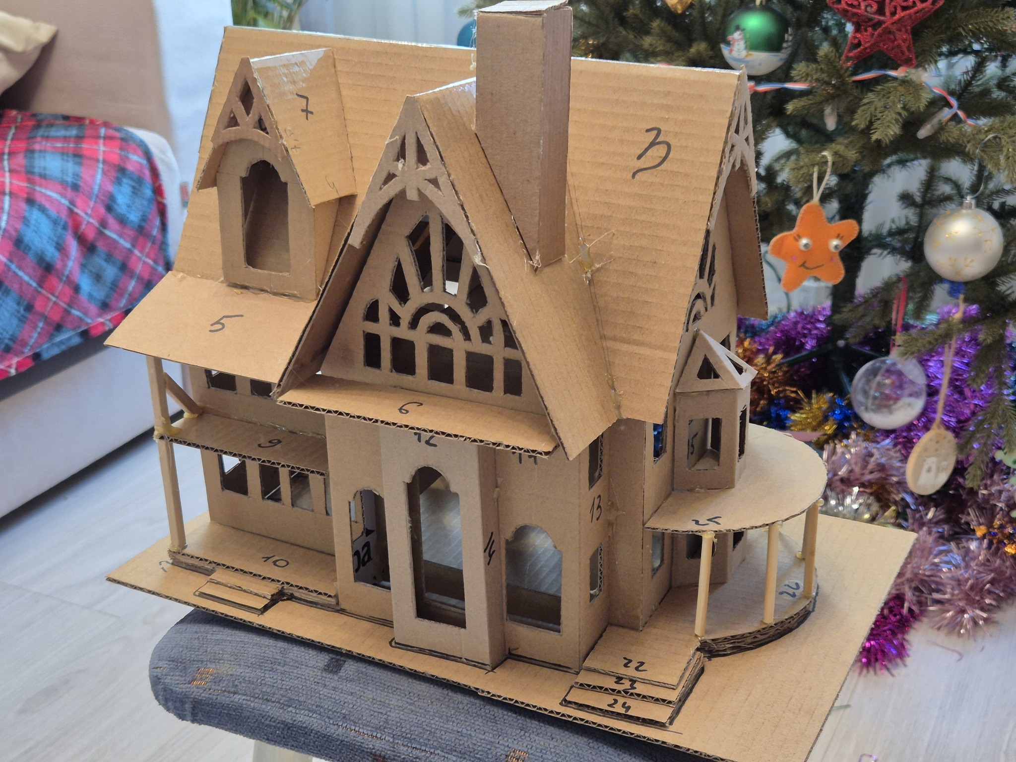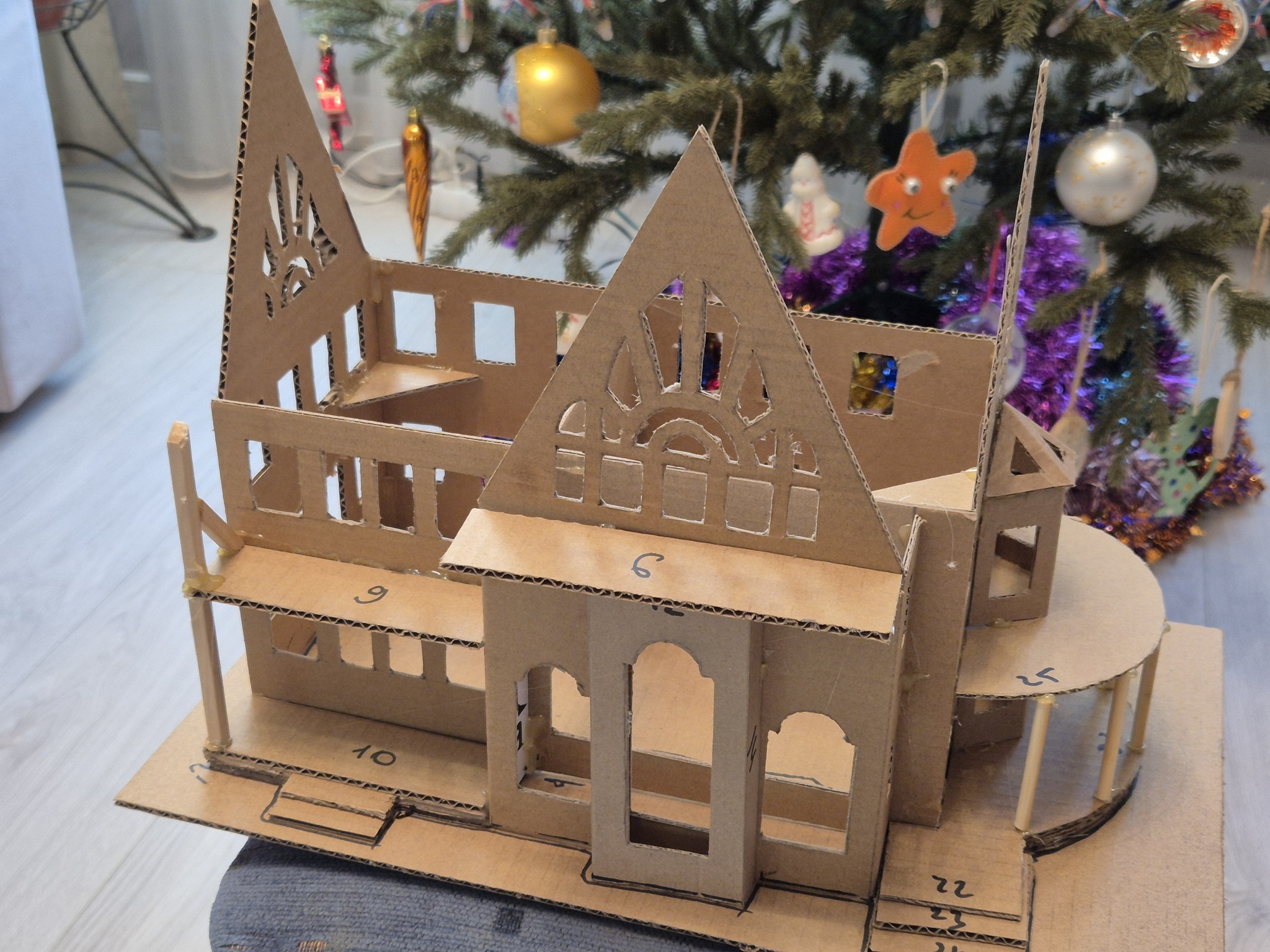 Когда чертежи готовы и распечатаны, можно приступать к домику? Да, но пока только к картонному! Ошибки в геометрии, обнаруженные на этапе готовых пряничных деталей, стоят очень дорого — потерянным временем и продуктами. Поэтому я всегда делаю макет из старых обувных коробок, склеивая детали клеевым пистолетом. Вот что получилось на этом этапе: