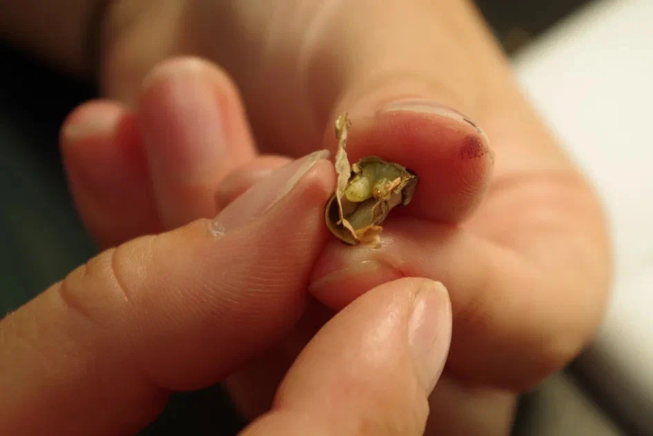 Как только плод обрастёт мясистой мякотью, на свет появится личинка. Выбираться из убежища она не станет. Зачем, когда твой дом одновременно ещё и еда? Пиршество гусенички будет длиться до тех пор, пока «яблочко» не засохнет. После этого оно падает на землю и разбивается на три части. В одной из них будет спрятана моль, в остальных — семена растения.