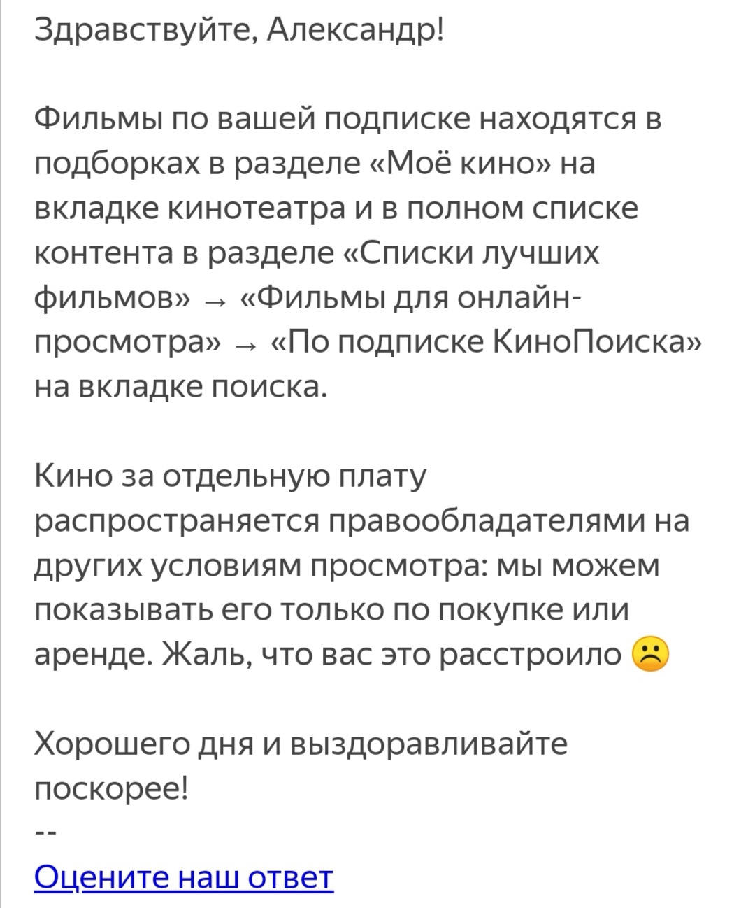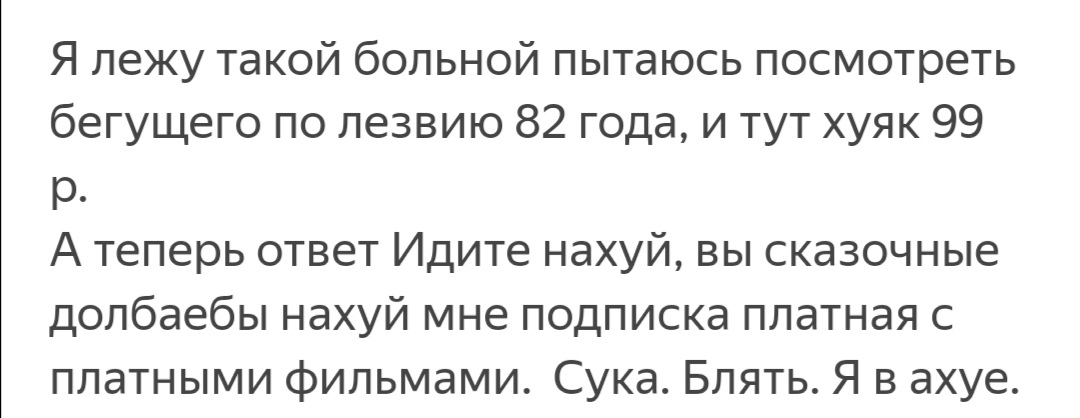 30 Bankpetrosyan Псевдо бесплатная подписка на кинопоиске. Ответ в поддержку 5 лет назад P. S. В итоге дали таки промокод на Бегущего по лезвию. Спасибо. Но я уже с торрента подсмотрел. [моё] Фильмы Подписки Длиннопост Ещё 0