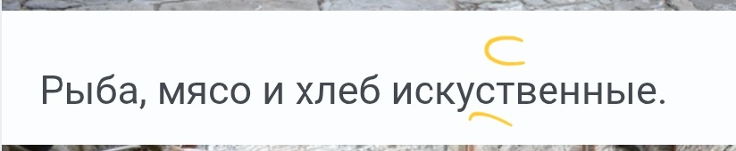 Рыба, мясо и хлеб искуственные.