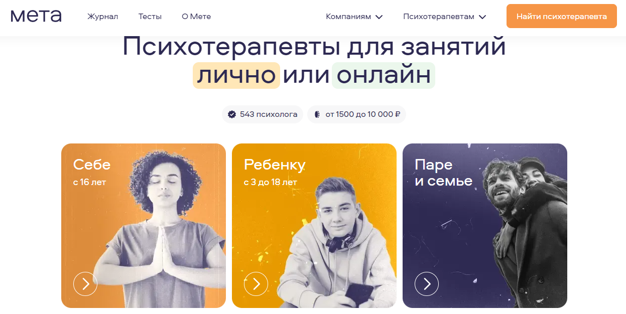Тета. Сервис предлагает первую 20-минутную консультацию без оплаты, возможность выбрать психолога онлайн или офлайн, а также бесплатные консультации для детей и подростков.