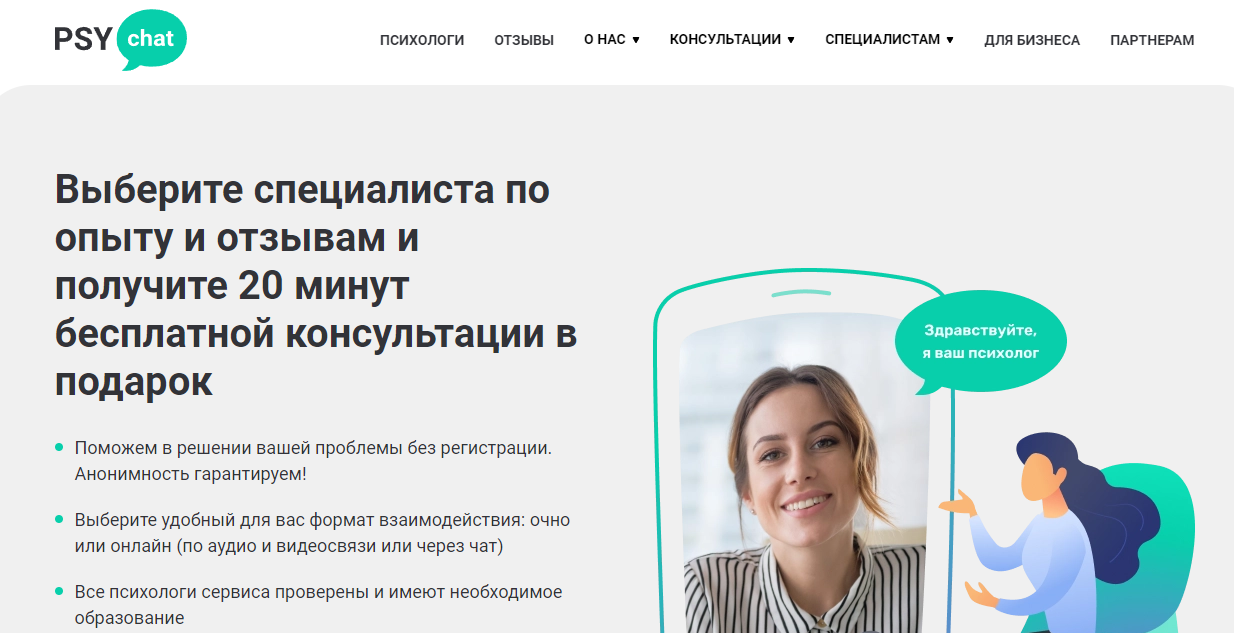 Онлайн-платформа, предоставляющая психологические консультации для взрослых и детей. Особенность Psy-Chat — удобный формат общения с психологами через мессенджеры. Первая 20-минутная консультация предоставляется бесплатно.