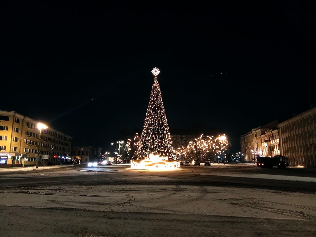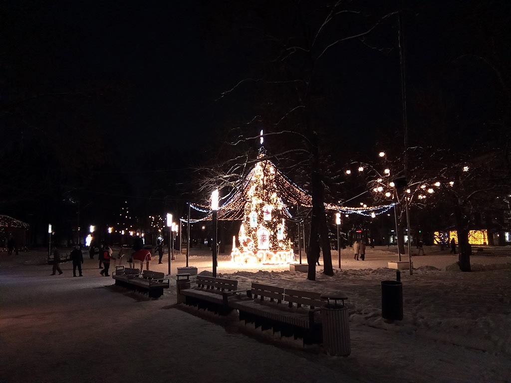 Вот она: центральная ёлка города. Как всегда прекрасная. Давеча какой-то придурок влетел в столб освещения и погасил не только улицу, но и ёлку. Но муниципалитет быстро всё починил. Молодцы!