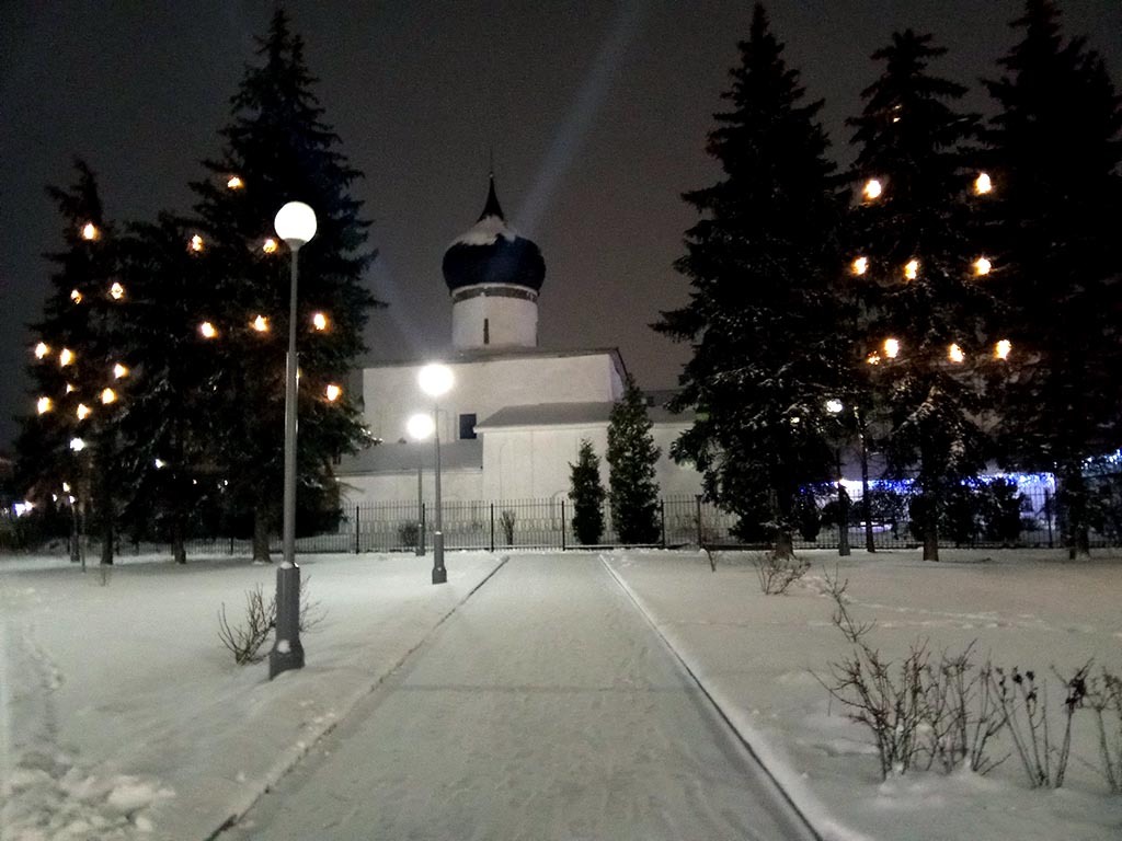 Сам храм Михаила Архангела в иллюминации. У него вокруг барабана идет пояс из уникальной мозаики. Если приедете в Псков, то экскурсоводы обязательно про него расскажут.