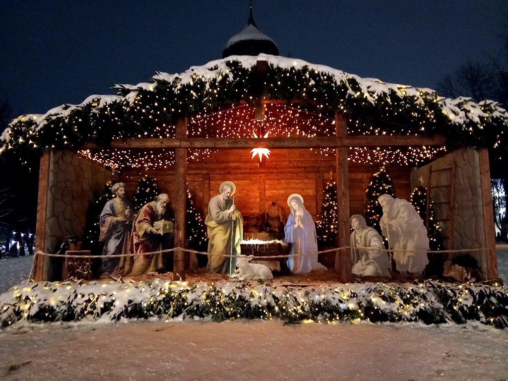 На центральной площади поставлен вертеп. Красиво устроено, не могу не признать. Внутри все как полагается: сено, ослик, младенец Иисус, и мать его Мария, и Иосиф. Не настоящие, конечно, а скульптуры. На потолке висят ангелы. Лепота, я считаю.