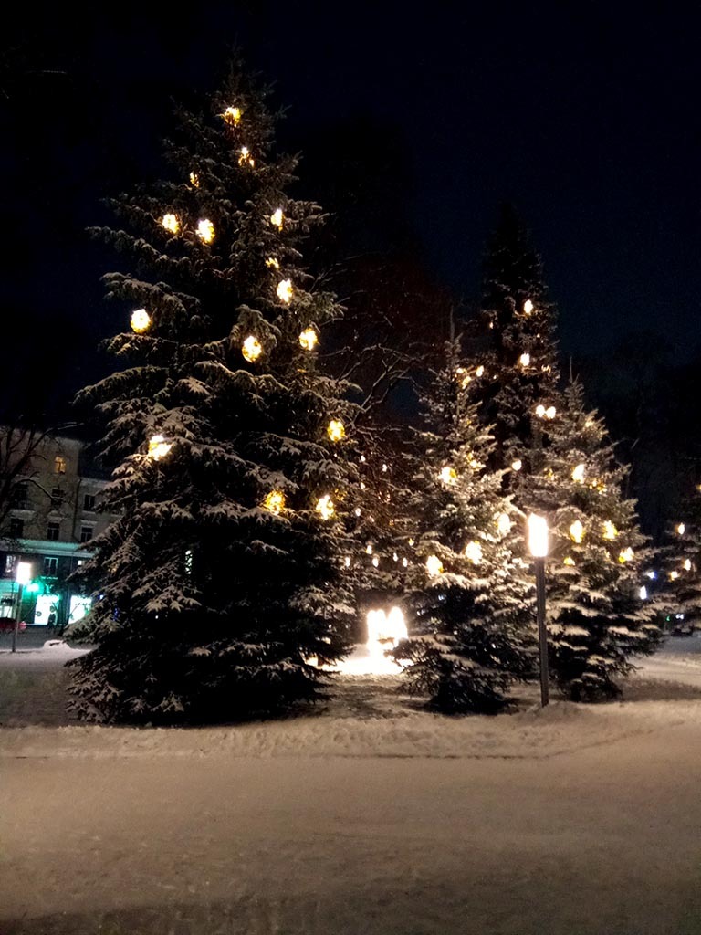 Украшенные ёлки везде. Вот елка у бывшего Детского мира. Та самая, где с советских времен в альковах стоят глиняные гномики, а псковичи пытаются утащить их к себе на дачу :)