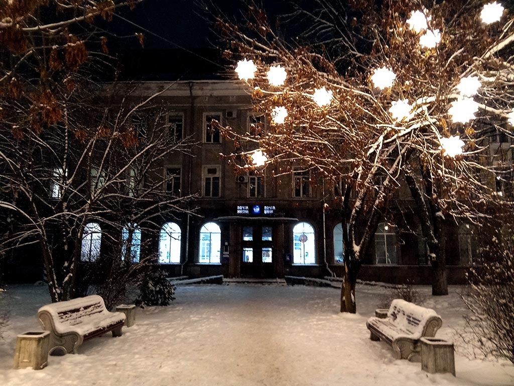 Фасад Новой Почты. Она, конечно, не новая, построенная после ВОВ, но для древнего Пскова это совсем-совсем новострой. Скверик перед входом так же обильно украшен огоньками, фигурками.