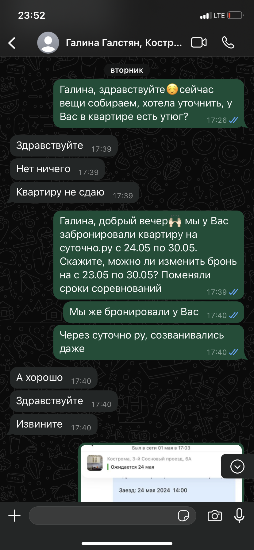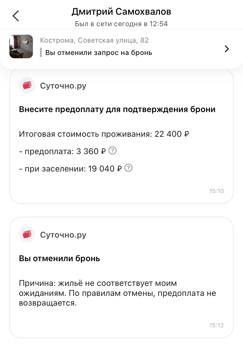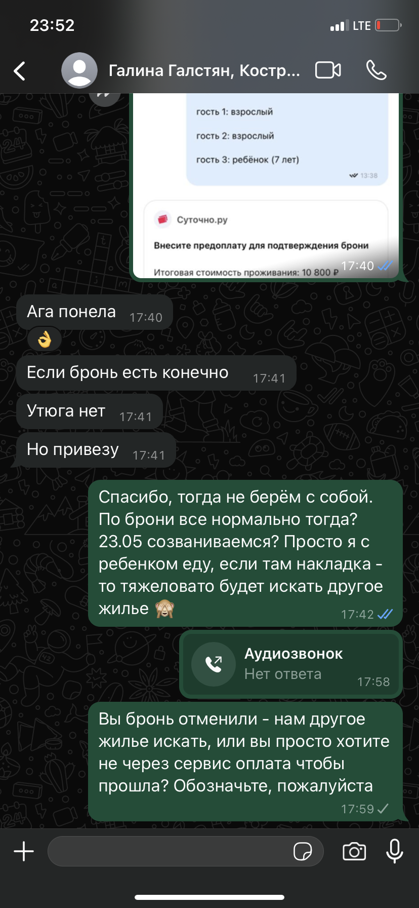 После ее ответа, что привезет утюг с суточно мне приходит уведомление, что хозяин отменил бронь.