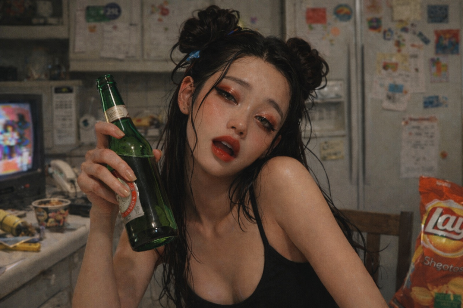 Мы садимся за стол. Она берет бутылку пива, в её глазах пустота: