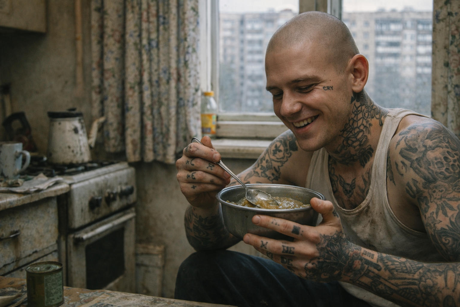 — Хочешь жрать? — спрашивает меня Лёня, усаживаясь за стол и продолжая орудовать ложкой.