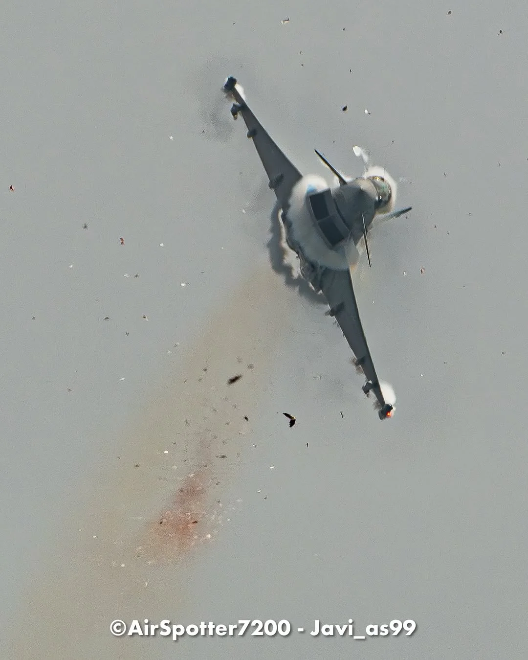 Истребитель Eurofighter Typhoon словил птицу в остекление кабины на авиашоу AIRE 25 в Испании. Пилот благополучно посадил самолет с разбитым остеклением. Пишут, что птица, которую разнесло в клочки, была редким видом орла и ее стоимость может быть сравнима со стоимостью ремонта самолета.