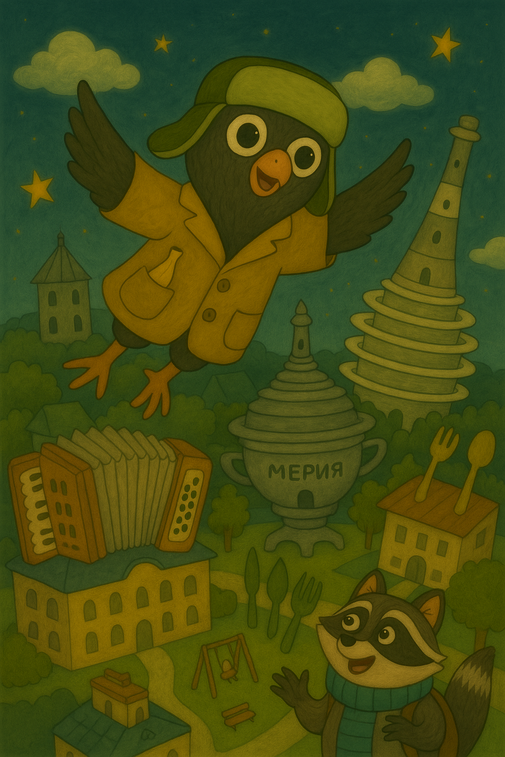 Он увидел дом в форме аккордеона, из окон которого доносилась музыка. Рядом с ним стояла башня, которая выглядела как стопка тарелок, и каждая тарелка была отдельным этажом. Он облетел здание мэрии, похожее на перевёрнутую кастрюлю. Полетал над парком, где деревья были в виде вилок и ложек, а дети катались на качелях, сделанных из чайных пакетиков.