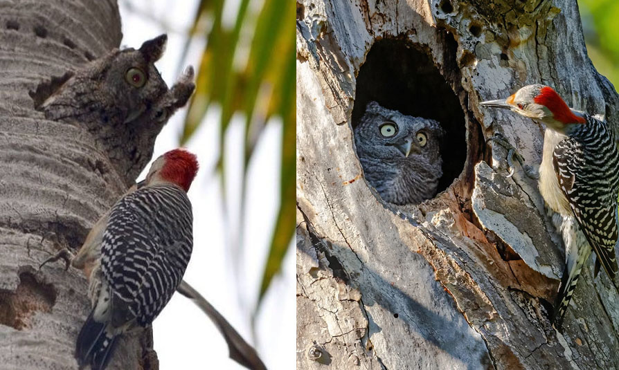 К сожалению, совы и дятлы часто выбирают объектом внимания одни и те же деревья. Многие совы днем отдыхают в дуплах, а дупла образовываются в сухих и начинающих высыхать деревьях, что в свою очередь сигнализирует дятлам о том, что под корой есть насекомые, которыми можно подкрепиться.