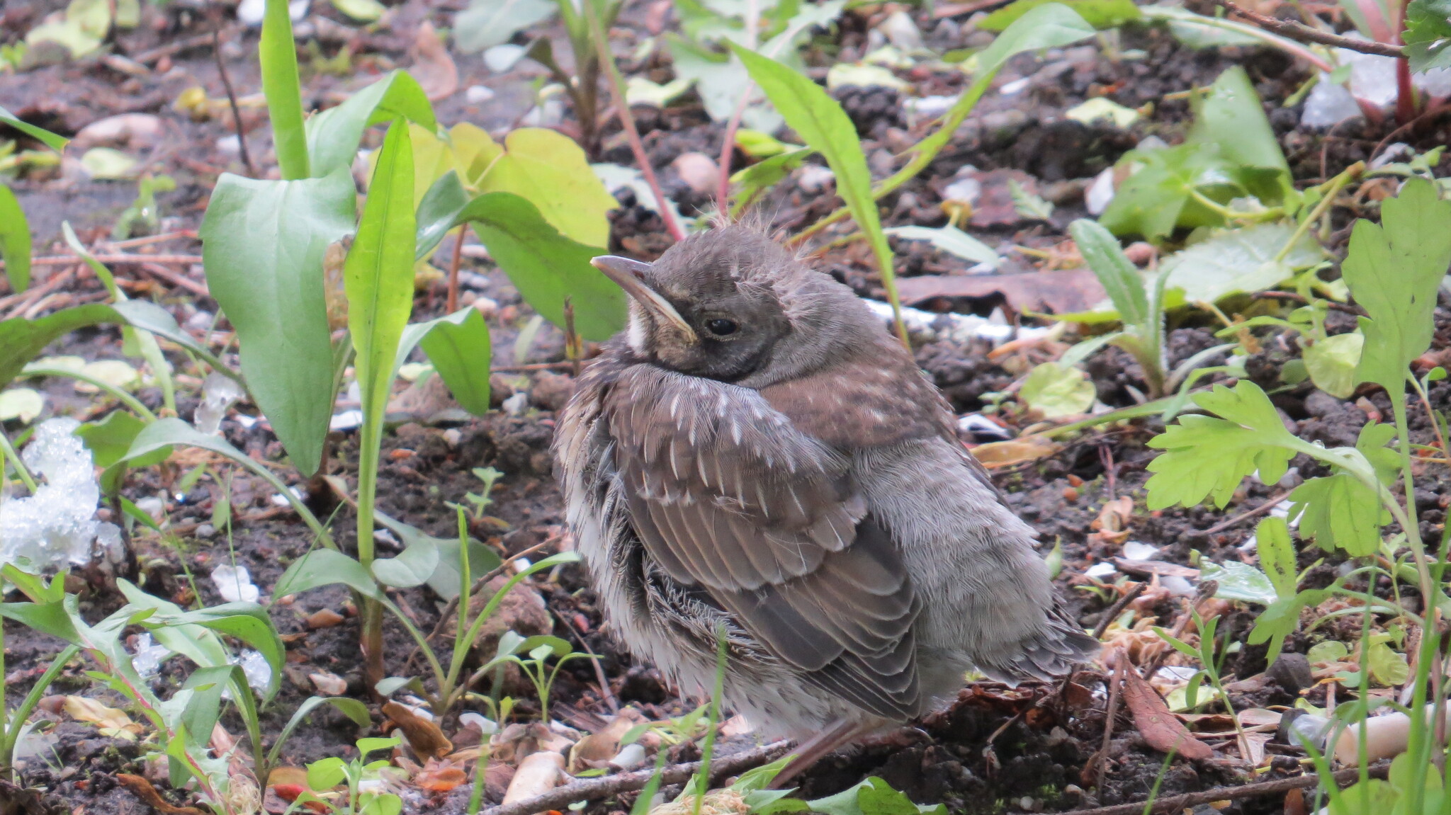 Слеток десантник с гнезда дроздов рябинников, 9 мая уже на земле. Момент их десантирования я не застал.