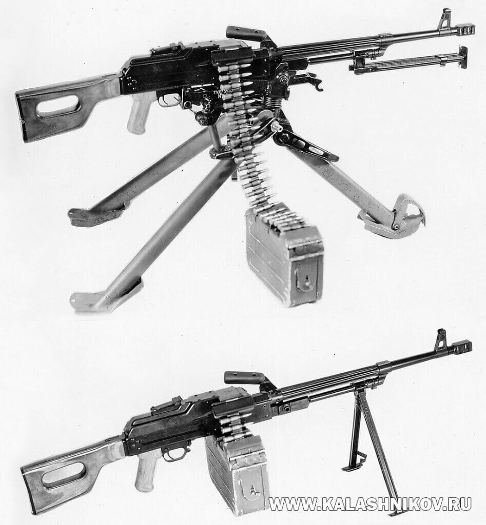 7,62-мм единый пулемёт Калашникова в ротном (на сошках) и батальонном (на станке Саможенкова) вариантах. Фото из технического описания. Таких пулемётов с двухкамерным дульным тормозом по-видимому не сохранилось