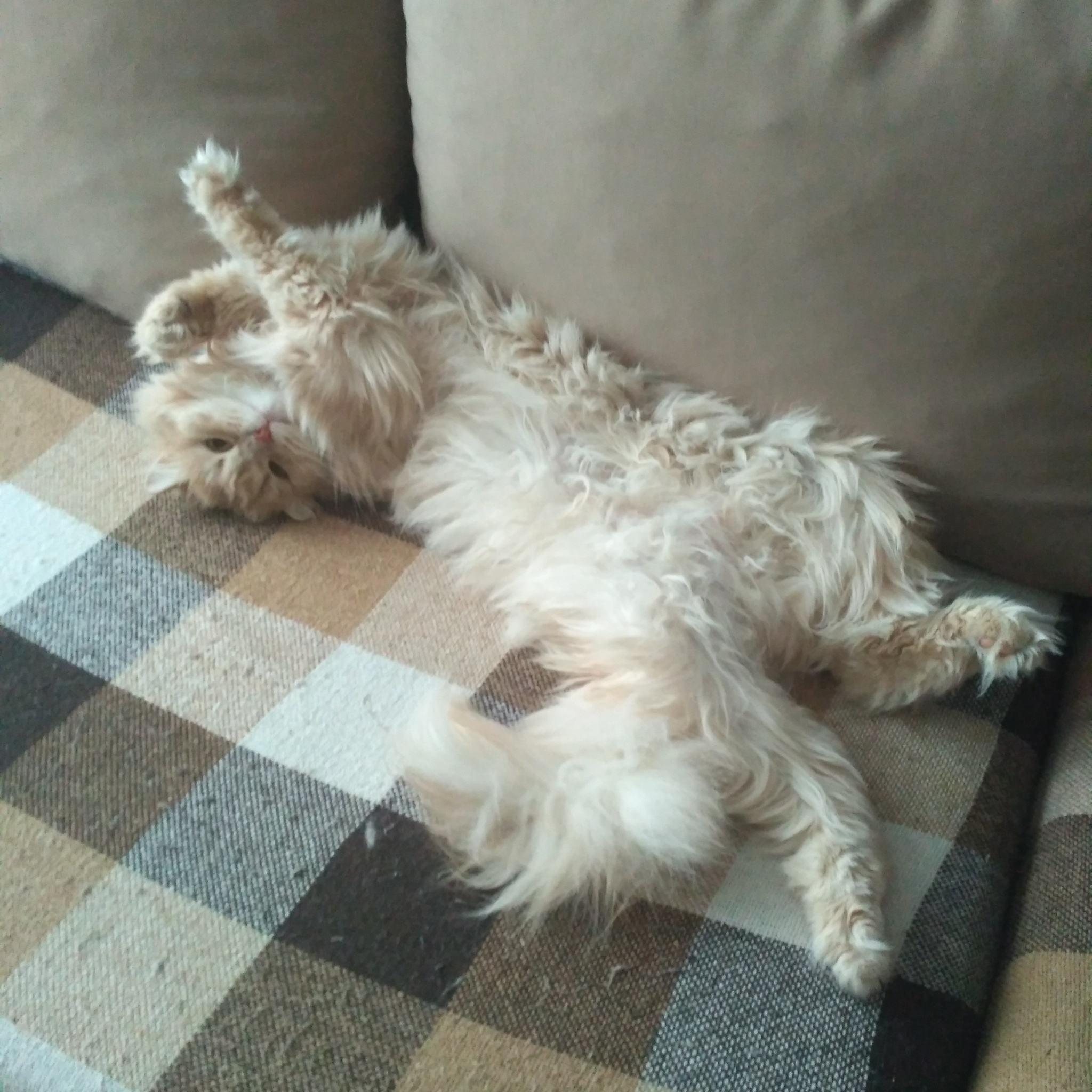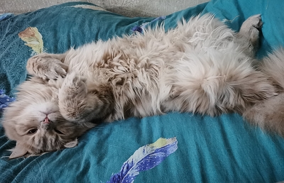 Он не любитель стричься, появилось пара колтунов- и то еле отстригла.. А когти когда стригу, так вообще кричит кошачьим матом)) Причесываться тоже не любит, но надо, Мурзилка, надо..