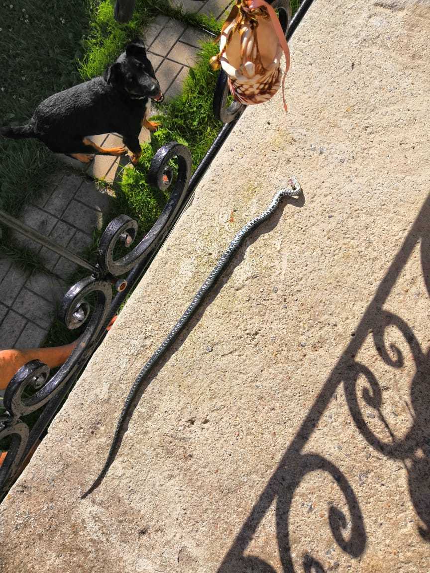 Вот такой подарочек моя псина сегодня на завтрак поймала на даче. Отобрали, выходили, выпустили в поле. Голосила, что отняли, обиделась, потом пыталась выкрасть. Повезло, что не ядовитый. Ну и ужика жалко, конечно. На фото счастливая убийца и жертва.