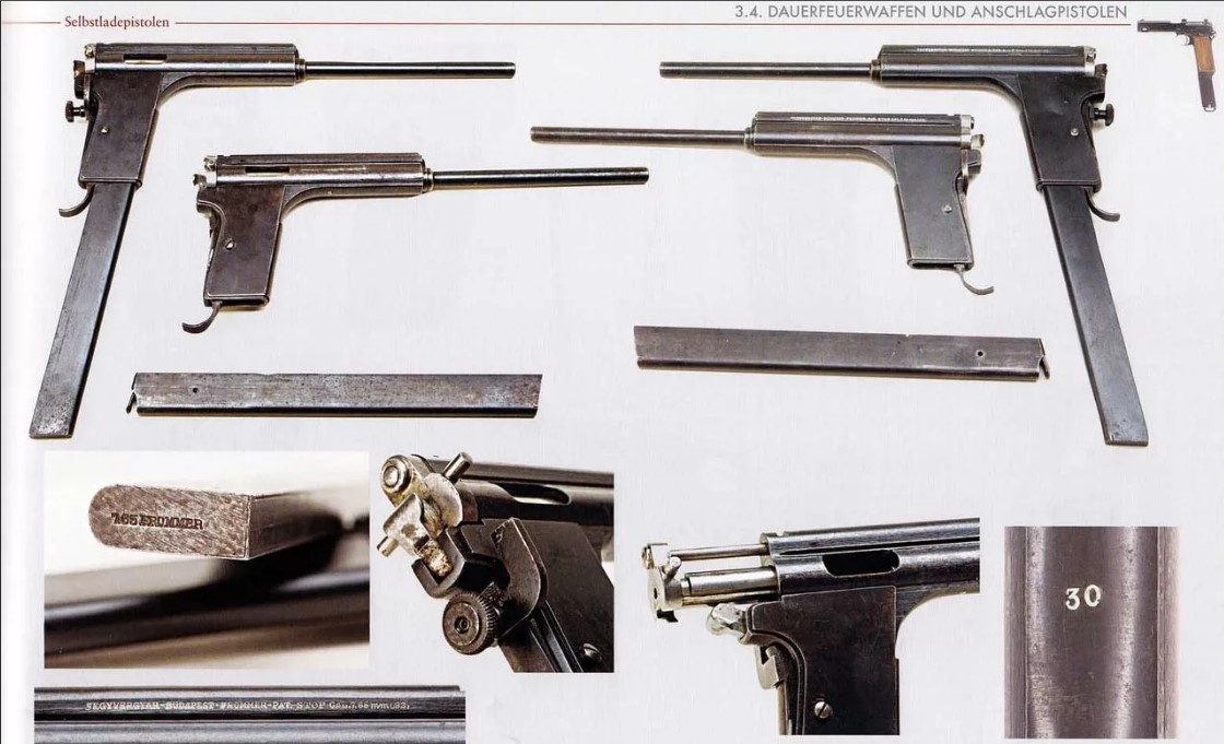 А, поскольку идеи витают в воздухе, в Австро-Венгрии появляется пистолет-пулемёт Фроммера, собранный из спаренных на станке пистолетов, перевёрнутых вверх магазином.