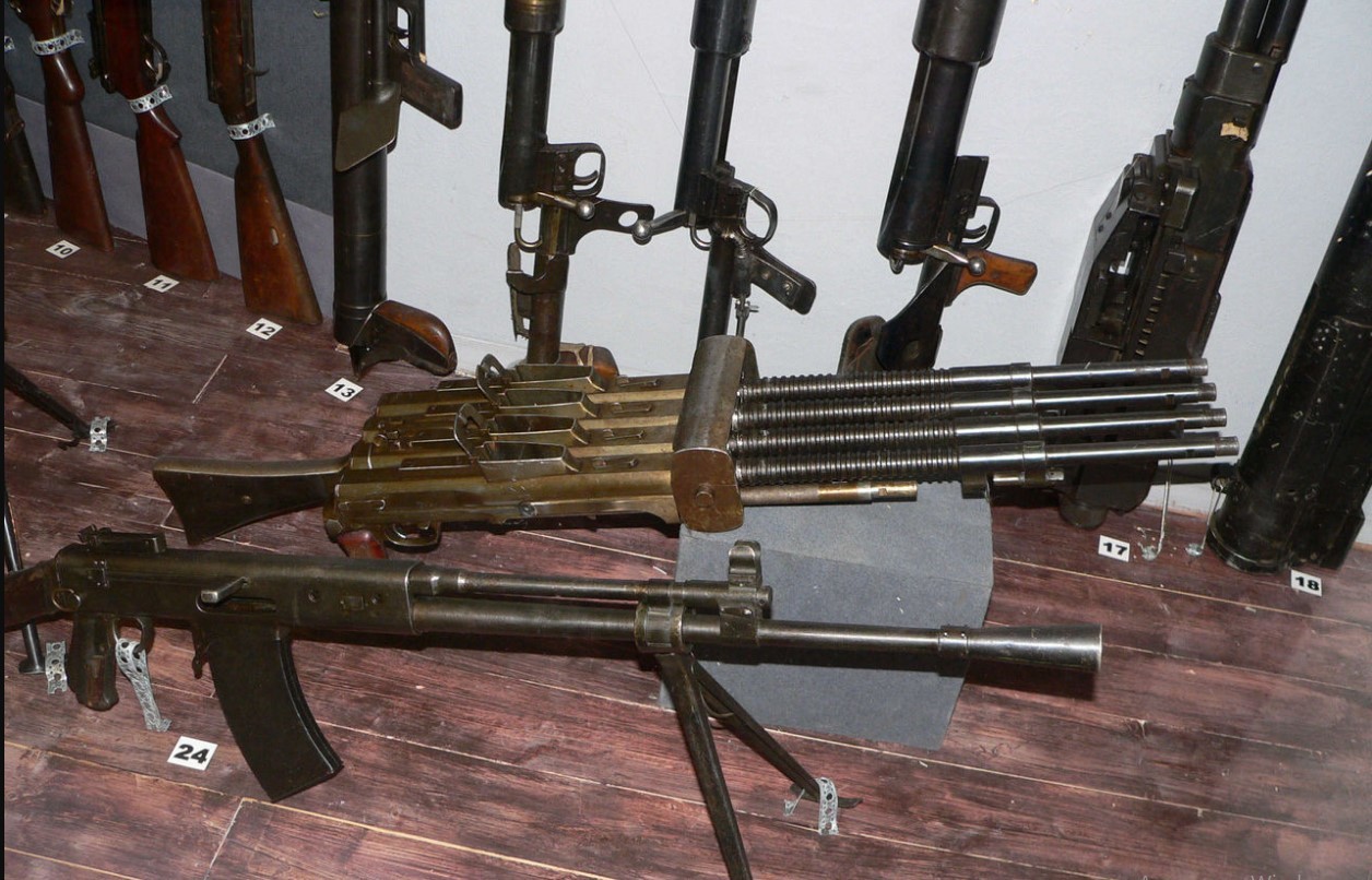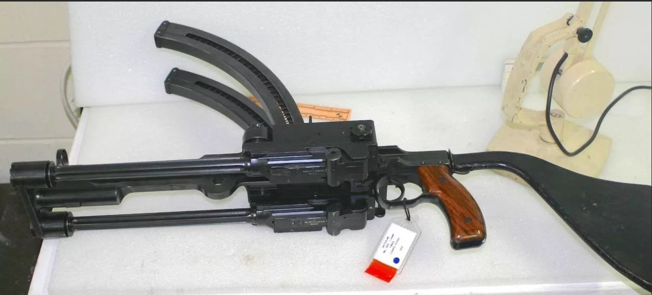 Вот, например, пистолет-пулемёт, собранный по той же схеме. Из интересного можно заметить рукоятку управления огнём, позаимствованную у немецких пулемётов МГ-34/42
