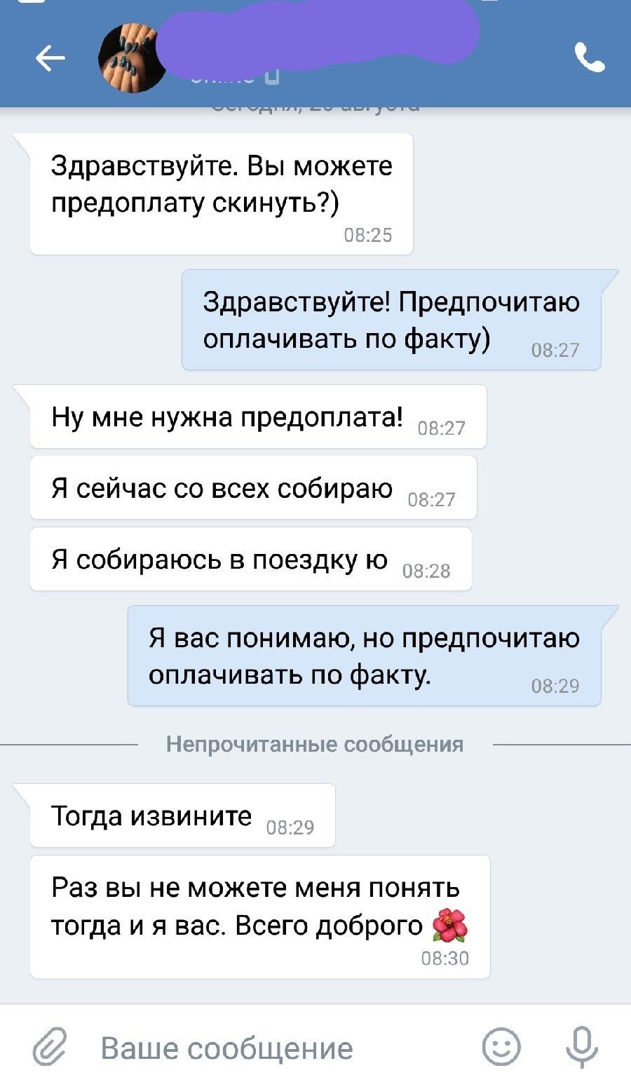 Подруга - стилист-визажист. Работает на дому в нашем поселке уже 5 лет, мастер отличный с единственным недостатком - неумением отказывать. Не раз была свидетелем как она отпахивала 15-16 часов без перерыва, а на следующий день валялась с температурой 39. Но всему приходит конец и Аня решила что так нельзя. Сначала заранее обьявила что 31 декабря работает до 18:00 (раньше было до 23:00). Честно говоря не думала что народ бывает таким охреневшим, например: