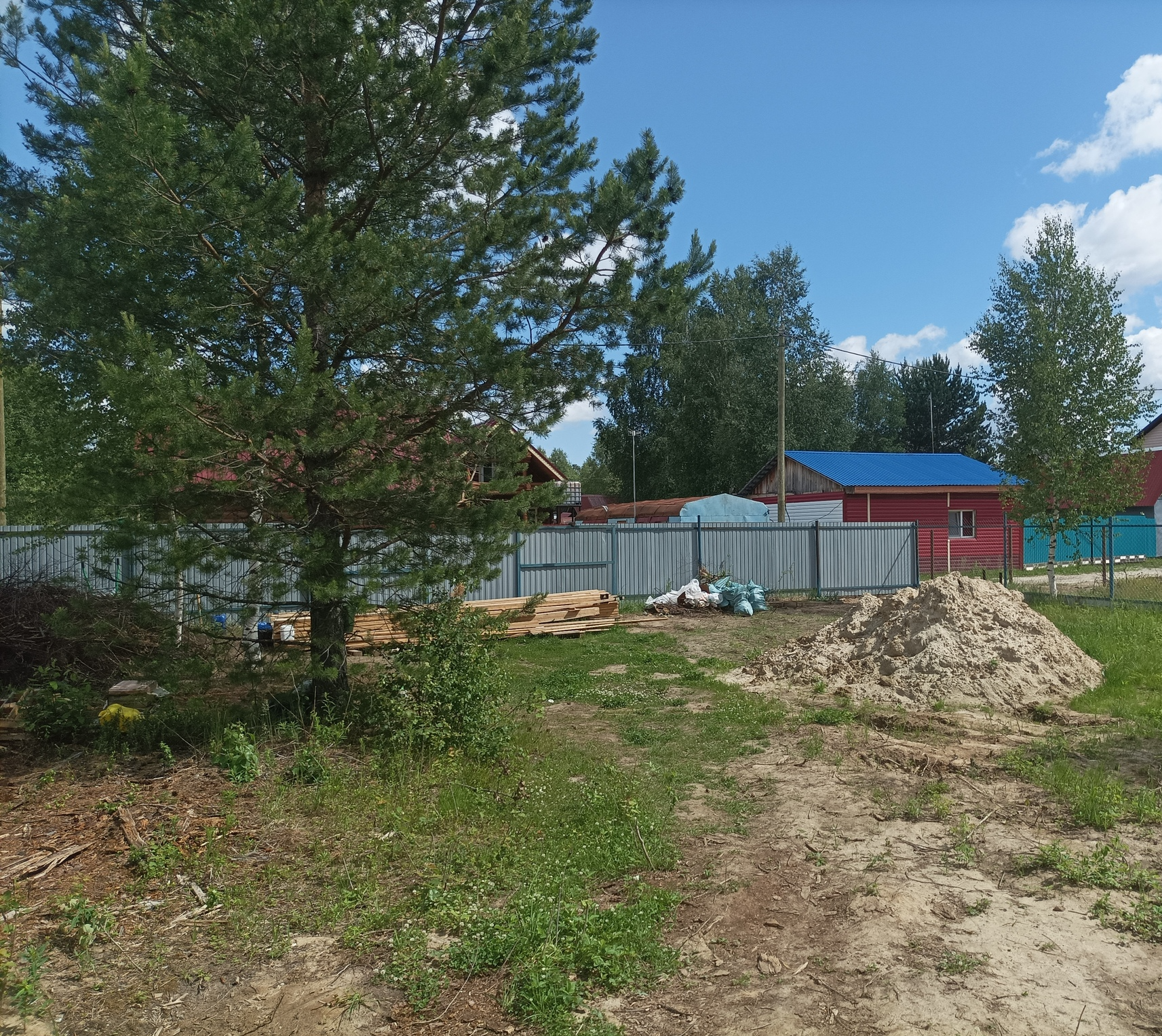 Его главным преимуществом стало наличие забора (сочетающего в себе сетку рабицу и деревянный горбыль) и ворота из профлиста на въезде. Так же он был относительно ровный.