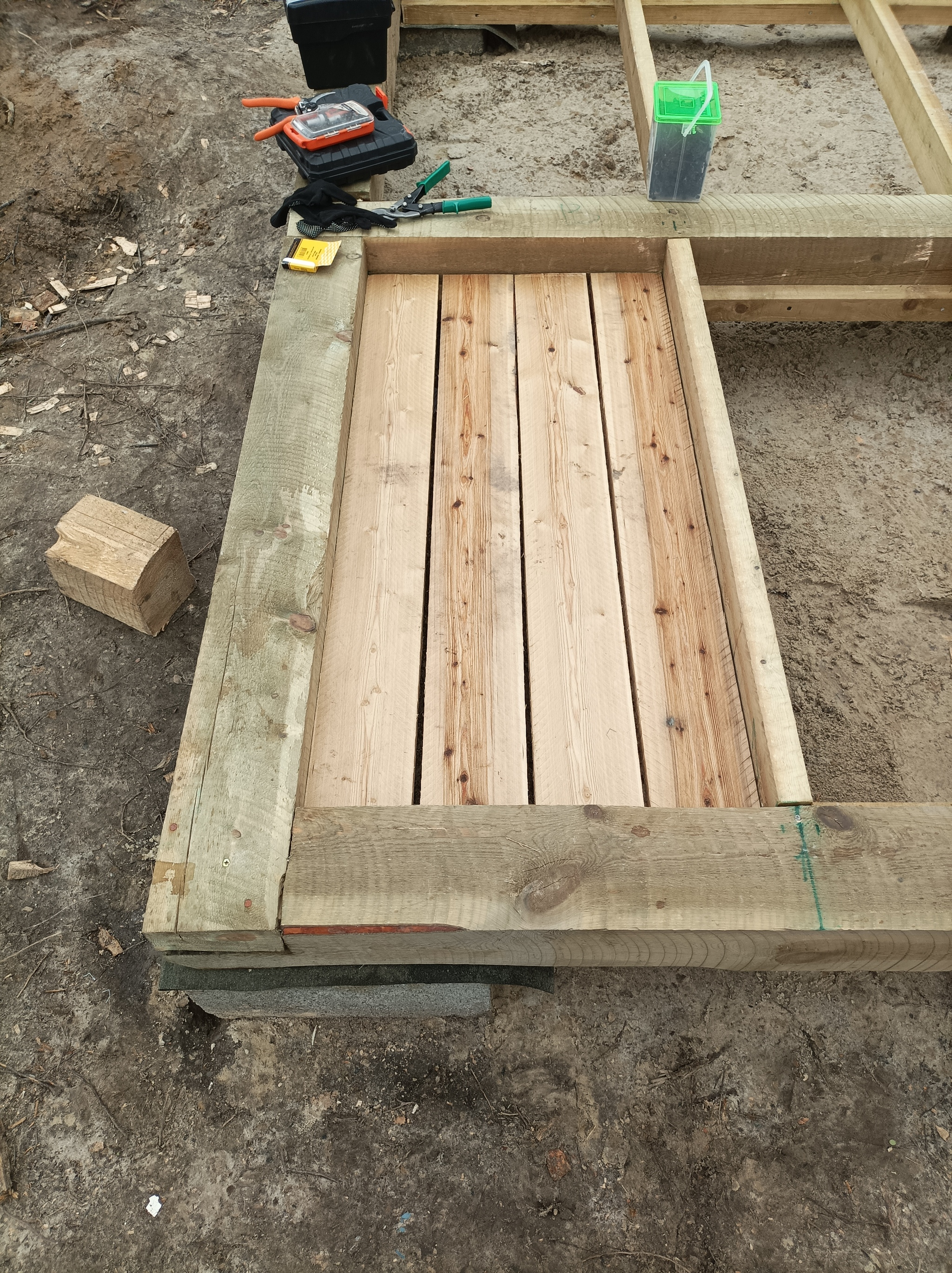 Пол был утеплен, закрыт плёнкой и поверх всего "пирога" , уложена та самая лиственница. Теперь "танцпол" полностью готов. На готовом полу было удобно собирать стены. Напоминает конструктор, деталька за деталькой. Сложил в нужном порядке, пробил гвоздями, поднял.