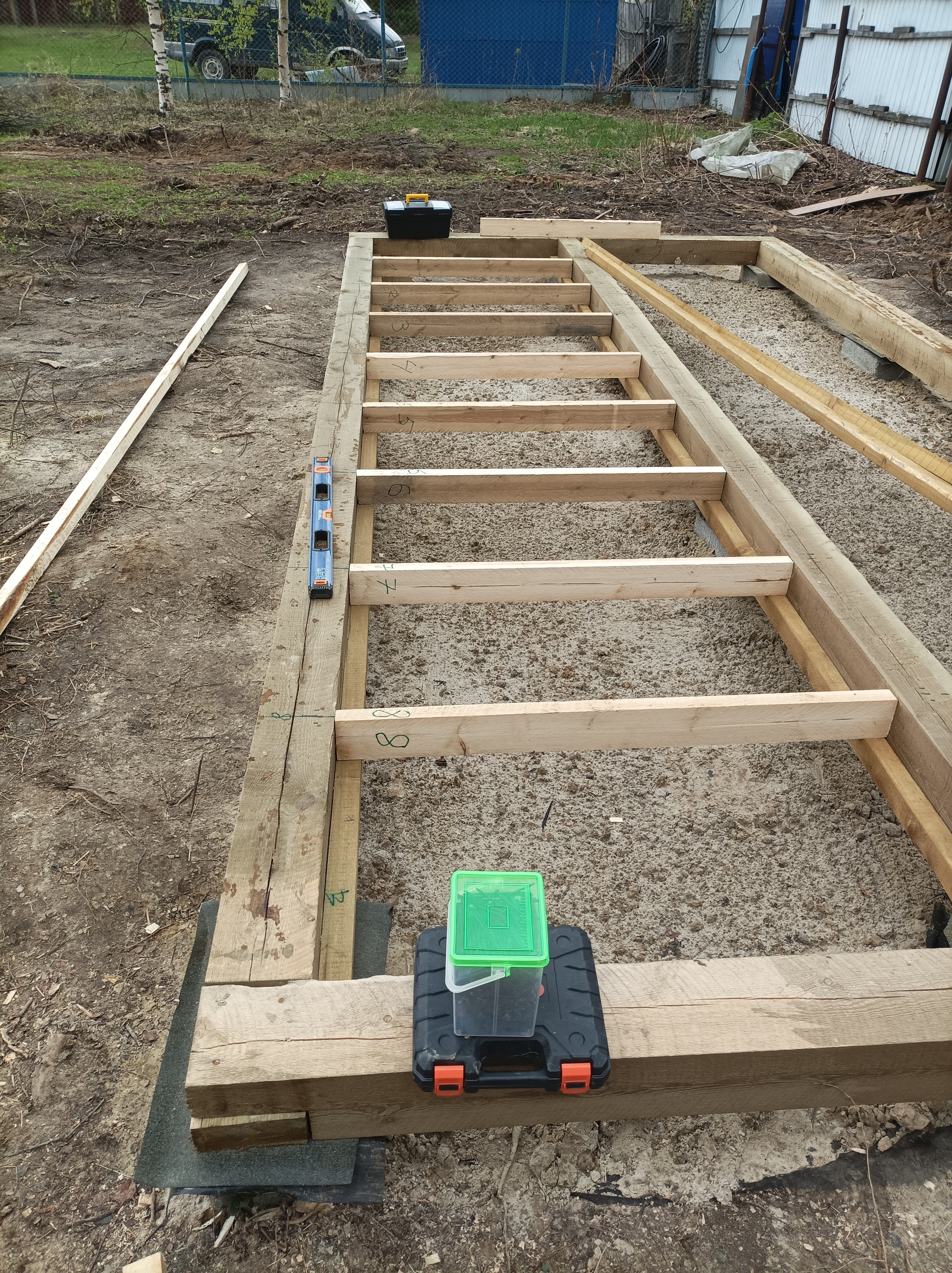 Брус был уложен на блоки, а значит положено начало работы с деревом. Между брусом, лаги пола, куда в дальнейшем ляжет утеплитель.
