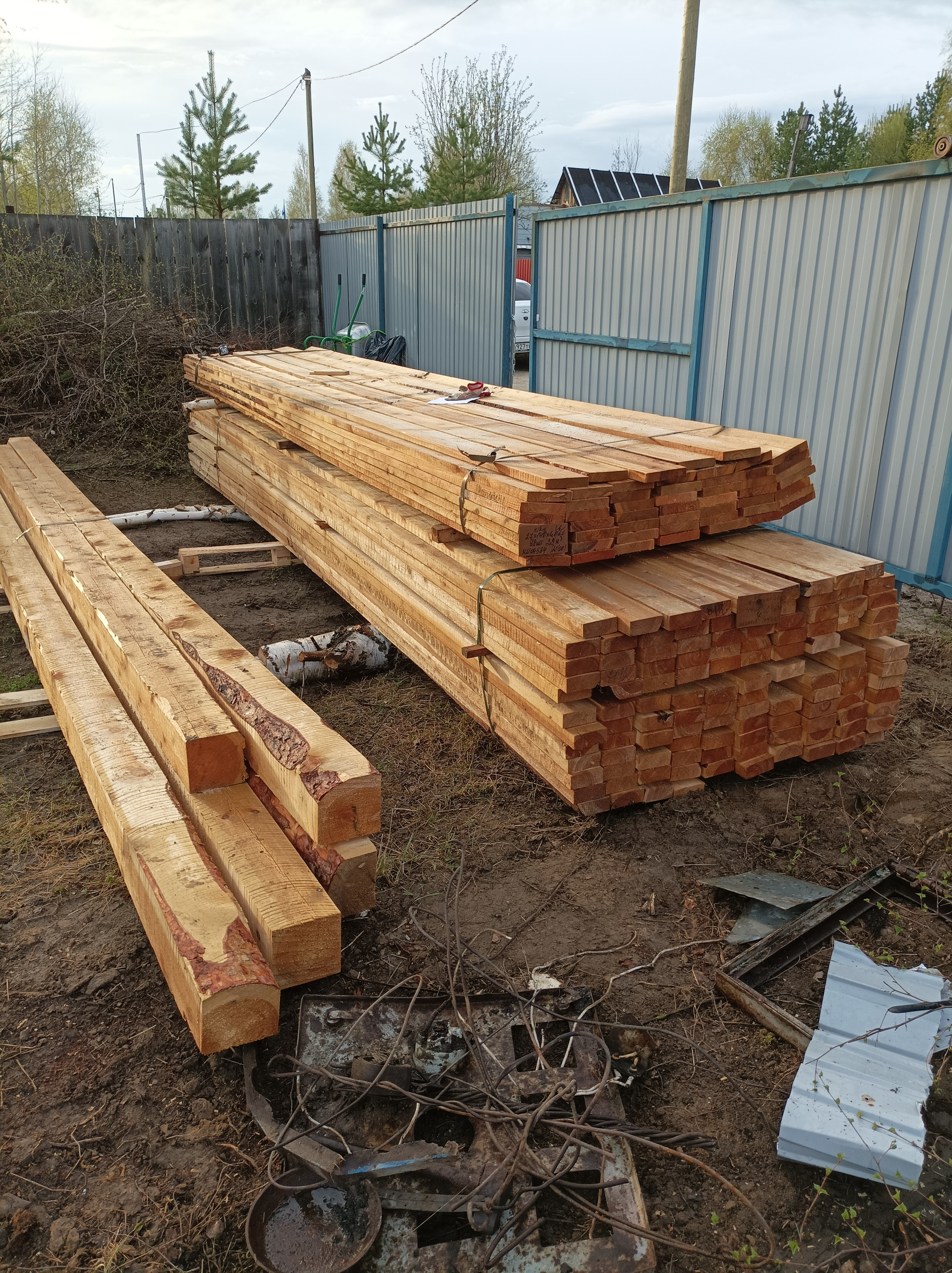 С пиломатериалами мне повезло. В городе у нас есть фабрика, на которой удалось прикупить его со скидкой. Это некондиция, попадался разный метраж, много обзола. Брус и большая пачка досок - это сосна, а вот наверху лежит драгоценная лиственница, говорят она не боится сырости.