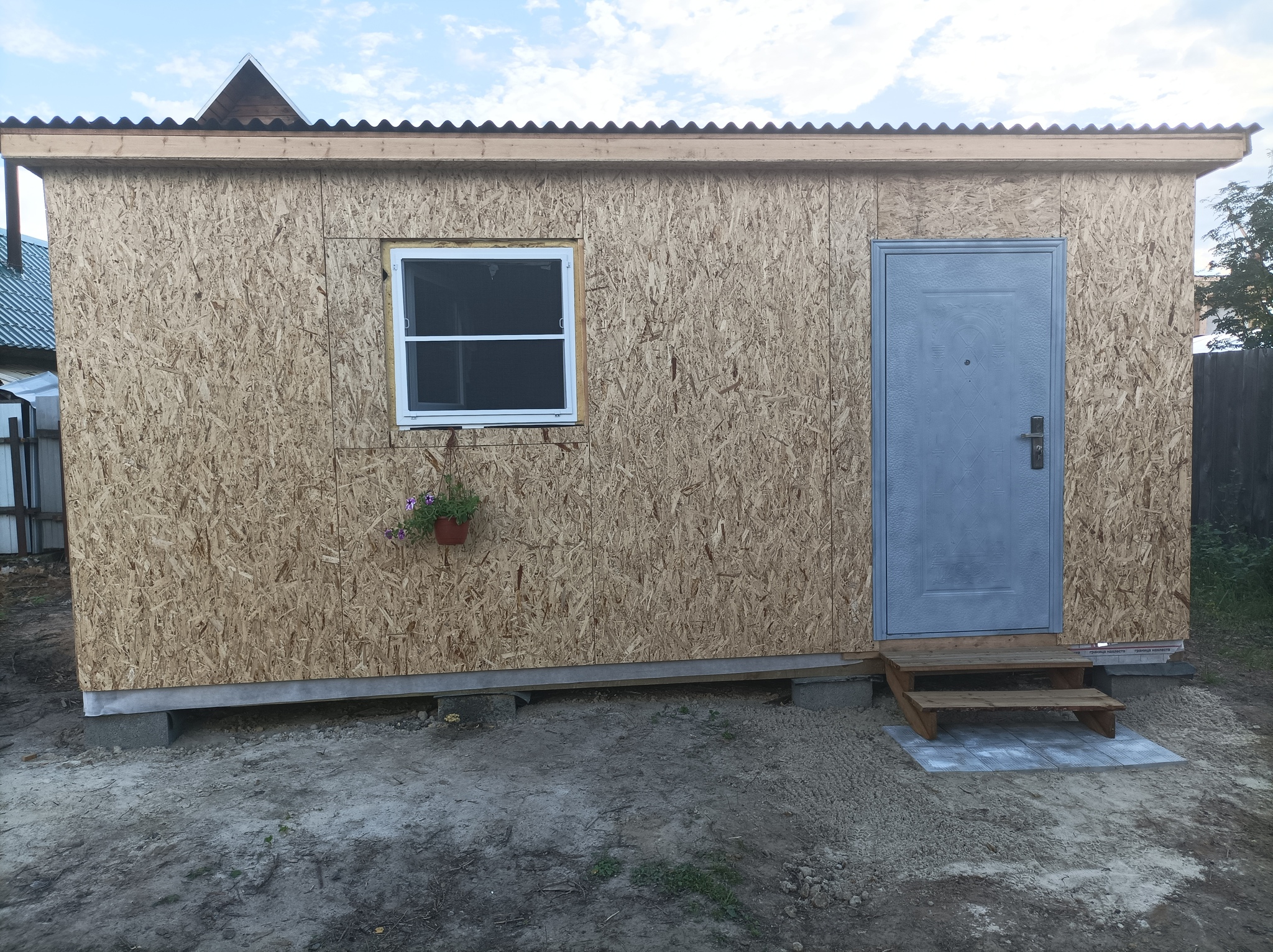 Пересмотрев кучу видео, сопоставляя свои физические и финансовые возможности остановился на таком варианте "мини дома". Выглядело не сложно для начинающего строителя: фундамент на блоках, обвязка из бруса, стены из доски и односкатная крыша.