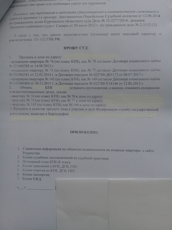 В настоящее время с 1997 года я проживаю в угловой квартире, на дверях которой при моем заселении был номер 78, имея прописку и все документы на квартиру 78, оказалось, что я занимаю чужую квартиру (в соответствии с планом БТИ) под номером 74. Соответственно в моей (по документам БТИ) 78 квартире, которая находится в середине этажа проживают люди, прописанные в квартире 82, а в их квартире (по документам БТИ) проживают хозяева моей квартиры 74, имея прописку в квартире №74 и занимая (по документам БТИ) квартиру 82. Часть квартир на нашем этаже уже в собственности, а часть в соцнайме. На все наши запросы в ДГИ и БТИ присылаются отписки, что с момента ввода в эксплуатацию никакого изменения нумерации квартир не происходило. Очень сложно объяснить людям, что необходимо привести наши документы в соответствие, народ всего боится. Удалось собрать инициативную группу из трёх человек, которые готовы выступить в суде в качестве истцов. Но проблема в том, что судью не устраивает формулировка нашего искового заявления. В нем мы просим оставить нашу фактическую нумерацию квартир и просто внести изменения в документы БТИ. Например: признать квартиру 74 (по плану БТИ) квартирой 78 (по факту). Если мы не исправим формулировки искового заявления или дополнительно не приложим каких-то еще документов, то она его не оставит без рассмотрения или откажет в иске.