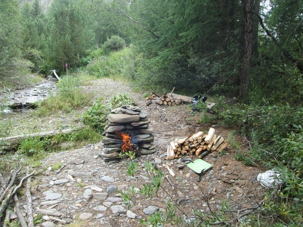 Перед стоянкой мы ещё раз бродили реку, Егор сказал, что до стоянки осталось не больше 500м. Стоянка реально классная и банное место есть. Лес кедровый, завтра полезем за шишками.