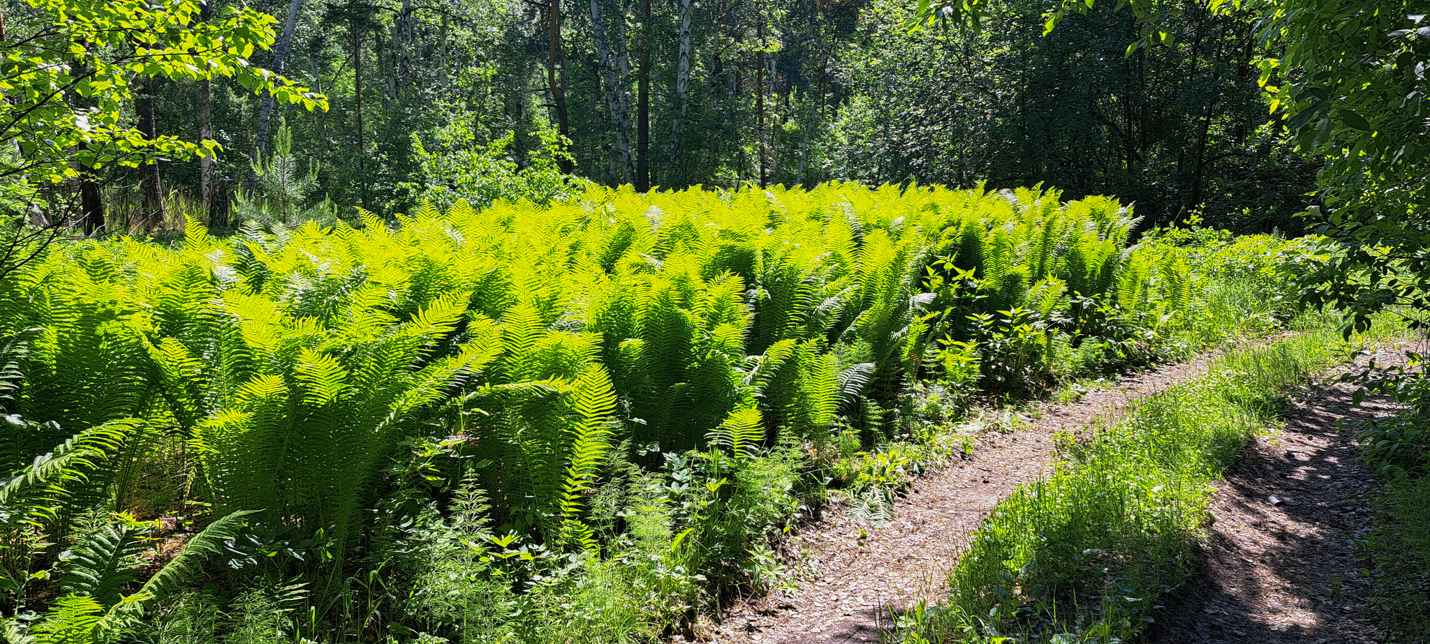 Далее идем по лесу в сторону озера Аракуль. Там несколько тропинок, но в целом заблудиться очень сложно (хотя кое-кому удалось, но об этом позже). По пути нам встречаются прекрасные папоротники.