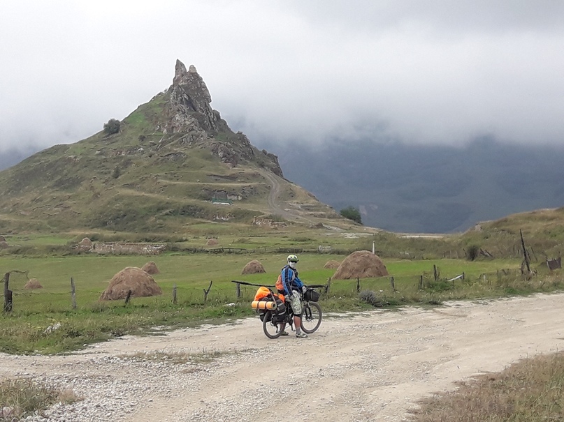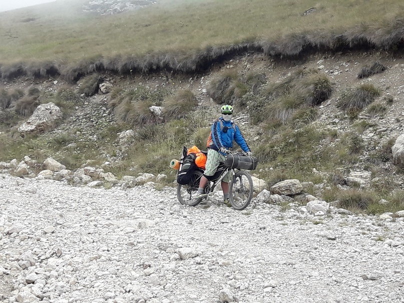 Спуск очень похож на спуск с перевала Актопрак, за исключением пастушьей собаки, которая очень желала с нами пообщаться. Но тон её и размеры не обещали ничего хорошего, поэтому мы от неё удрали. Уклоны спуска чуть круче и камни под колёсами чуть крупнее. Встречаются промытые водой продольные колеи. Ещё как-то резко стала портиться погода.