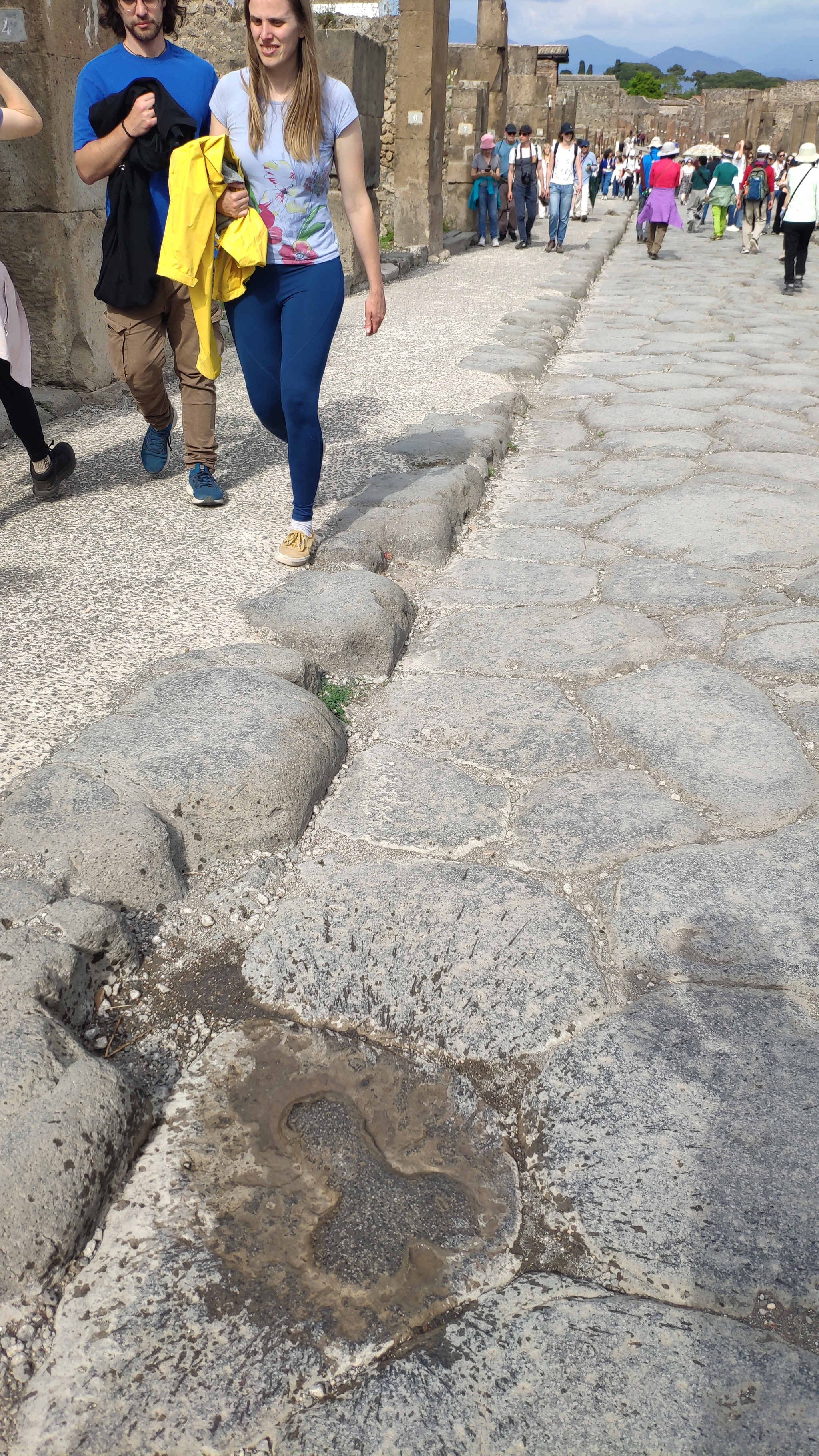 Самое невероятное в Помпеях - это прикоснуться к каменной мостовой, которая была за долгие годы разъезжена телегами какие-то несколько тысяч лет назад. Чтобы понимать уровень цивилизации: были улицы с двухсторонним движением, где по центру улицы лежало три камня и с односторонним - там где два камня.