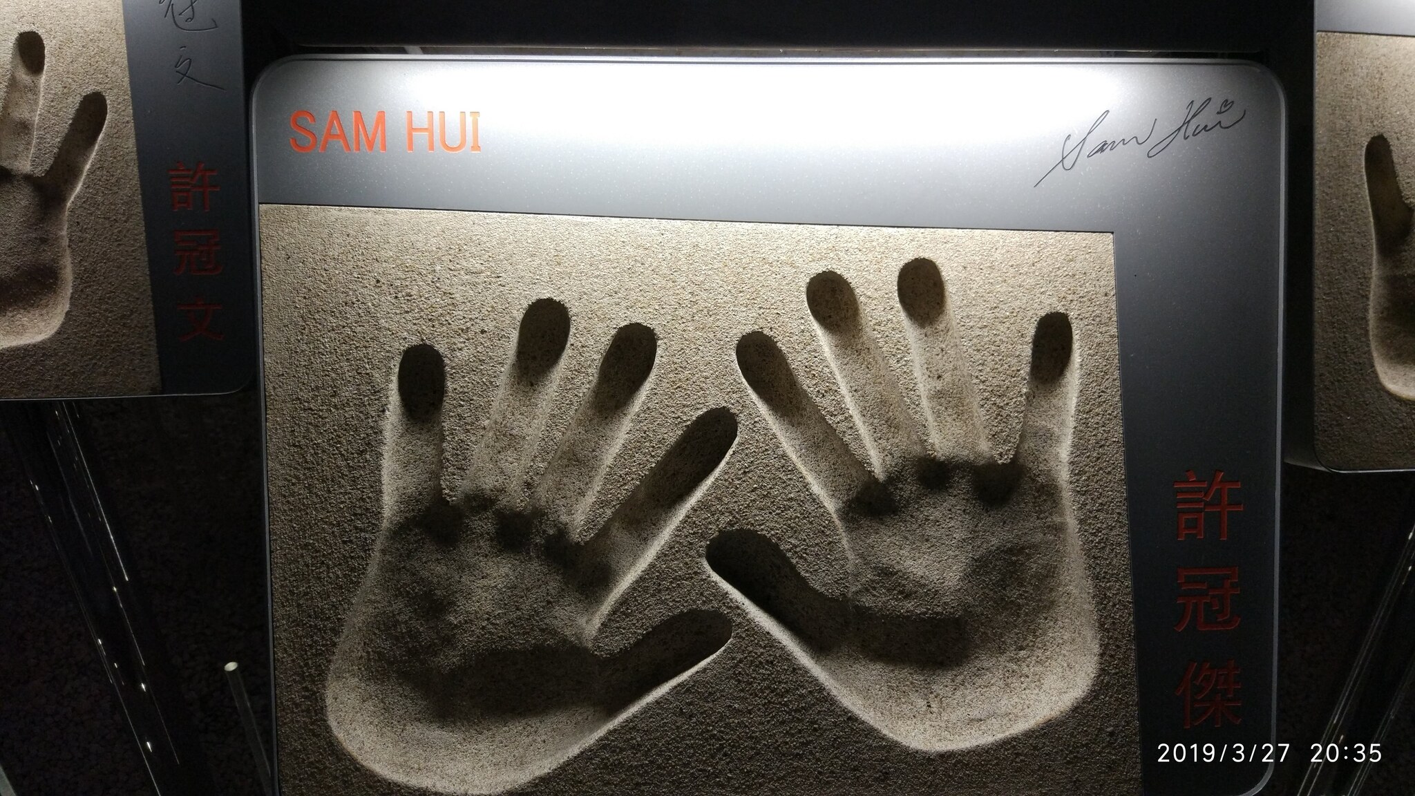 Вдоль перил Аллеи Звёзд расположены таблички с информацией и отпечатками рук известных людей сферы киноискусств.