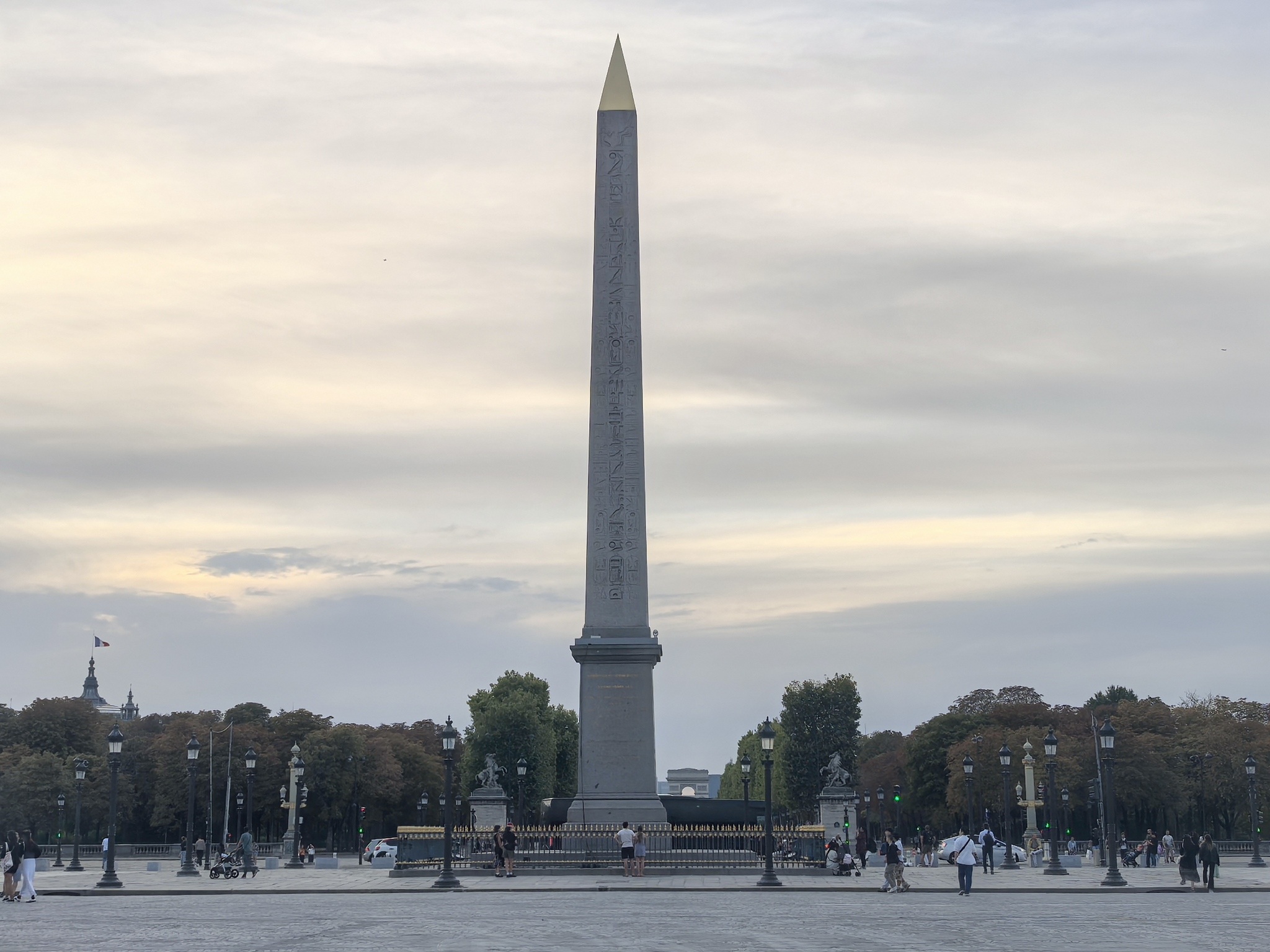 Египетская сила Obélisque de Louxor на площади Согласия, вдали триумфальная арка и Елисейские поля