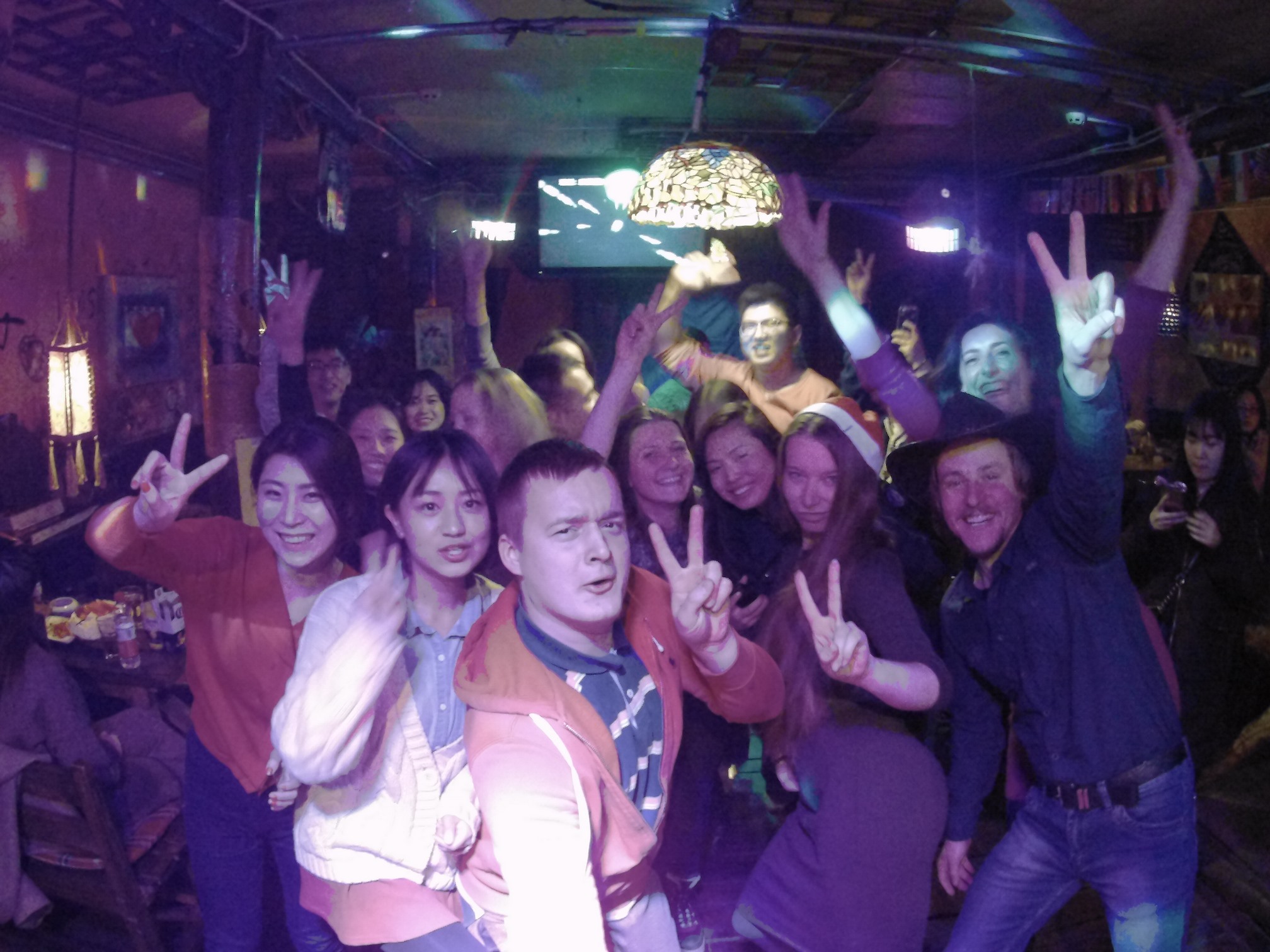 и уже поздно вечером, мы пошли искать бар, где можно было встретить праздник. А так как настроение было приподнятое, мы горланили новогодние песни на все узенькие китайские улочки и собрали вокруг себя азиатских энтузиастов, которые нам подпевали. Где-то есть даже видео, где мы организованной толпой штурмуем местные бары. Те не были предназначены для такого количества народа, и, мало помалу, люди редели, оседая за свободными столиками. Вскоре нашли себе место и мы. Кажется, бар назывался «Сакура». Там мы, отплясывая под международные хиты девяностых, разношёрстной толпой встретили Новый год.